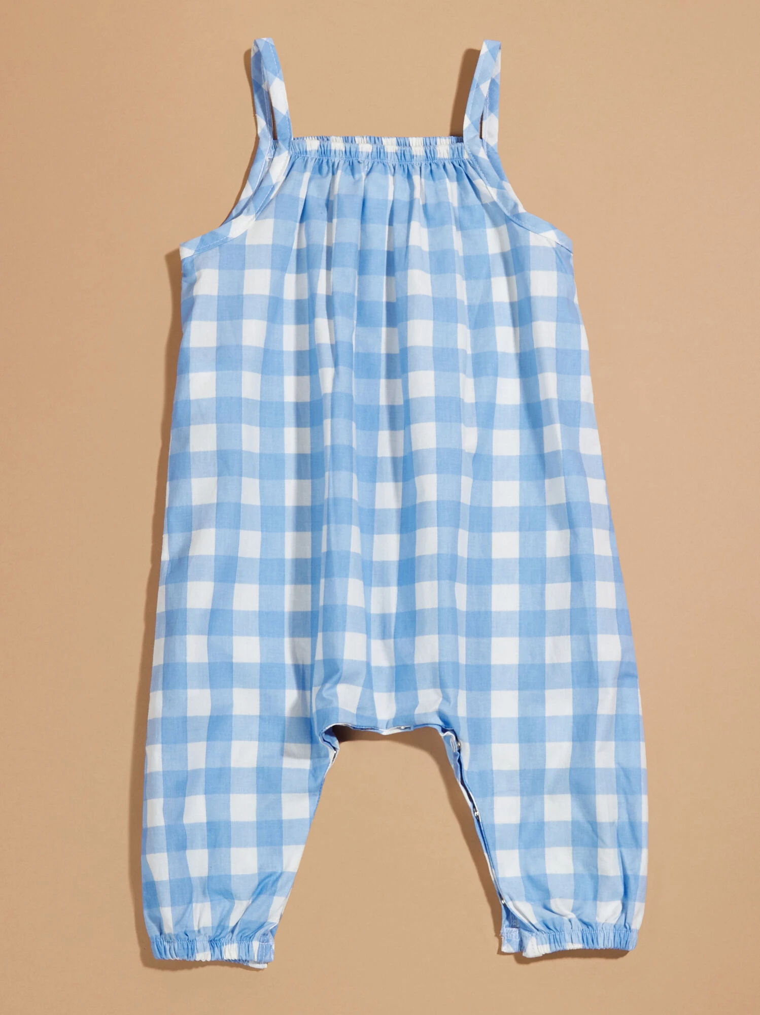 Happiness is home grown in our sunflower jumpsuit designed with a gingham pattern featuring a crochet sunflower and an embroidered bee detail. The jumpsuit snaps along the inseam and completed the full look with an elastic band around the leg holes and at the top of the tank.