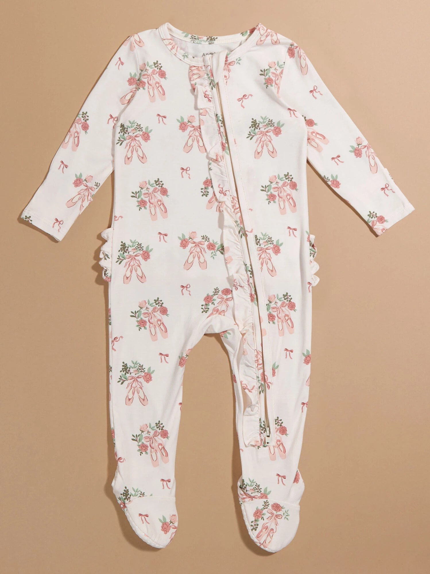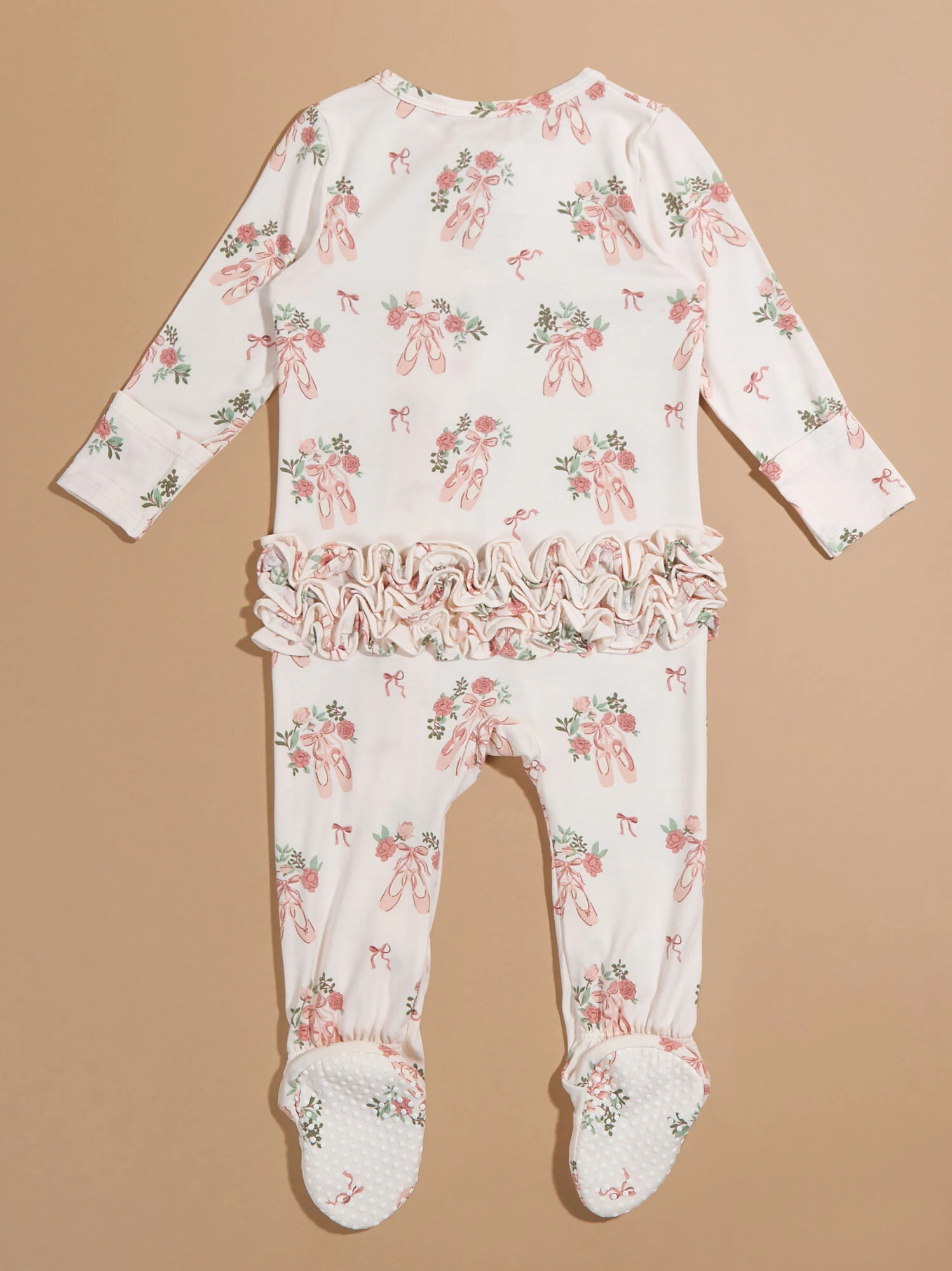 This sweet footie is adorned with a tiered ruffle detail and a ballet shoe print, crafted with eco-friendly materials for your precious little dancer. The buttery soft material from bamboo offers ultimate breathability for ultimate comfort, while the two-way zipper and fold over hand cuffs meet your practical needs.