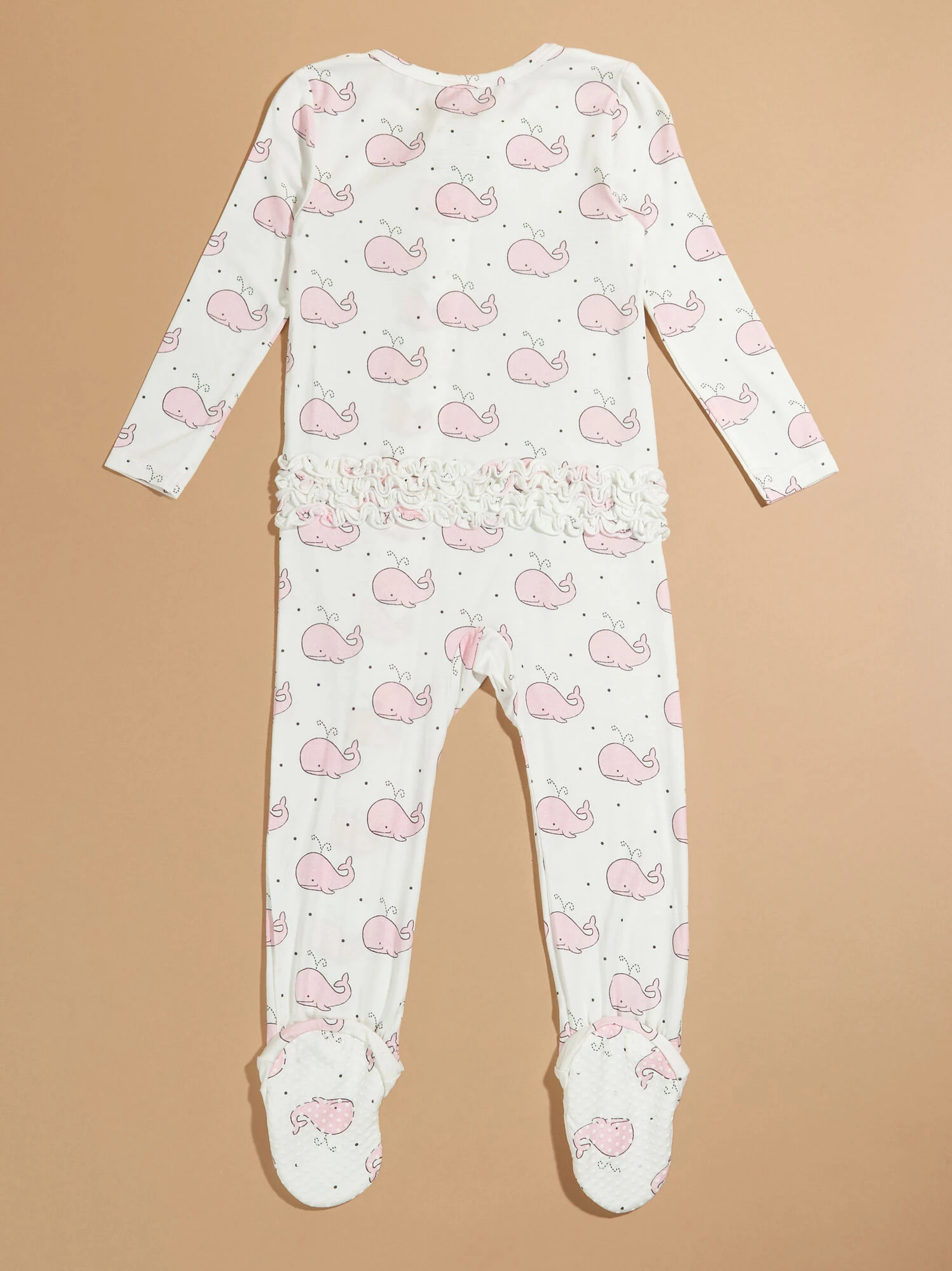 This perfect pink whale print will have your mini sleeping so peacefully. The eco-friendly buttery soft bamboo material ensures a lightweight comfort. This footie offers grips at the bottom of this footie and a two way zipper for the easiest access to change your babe while incorporating a ruffle booty detail.