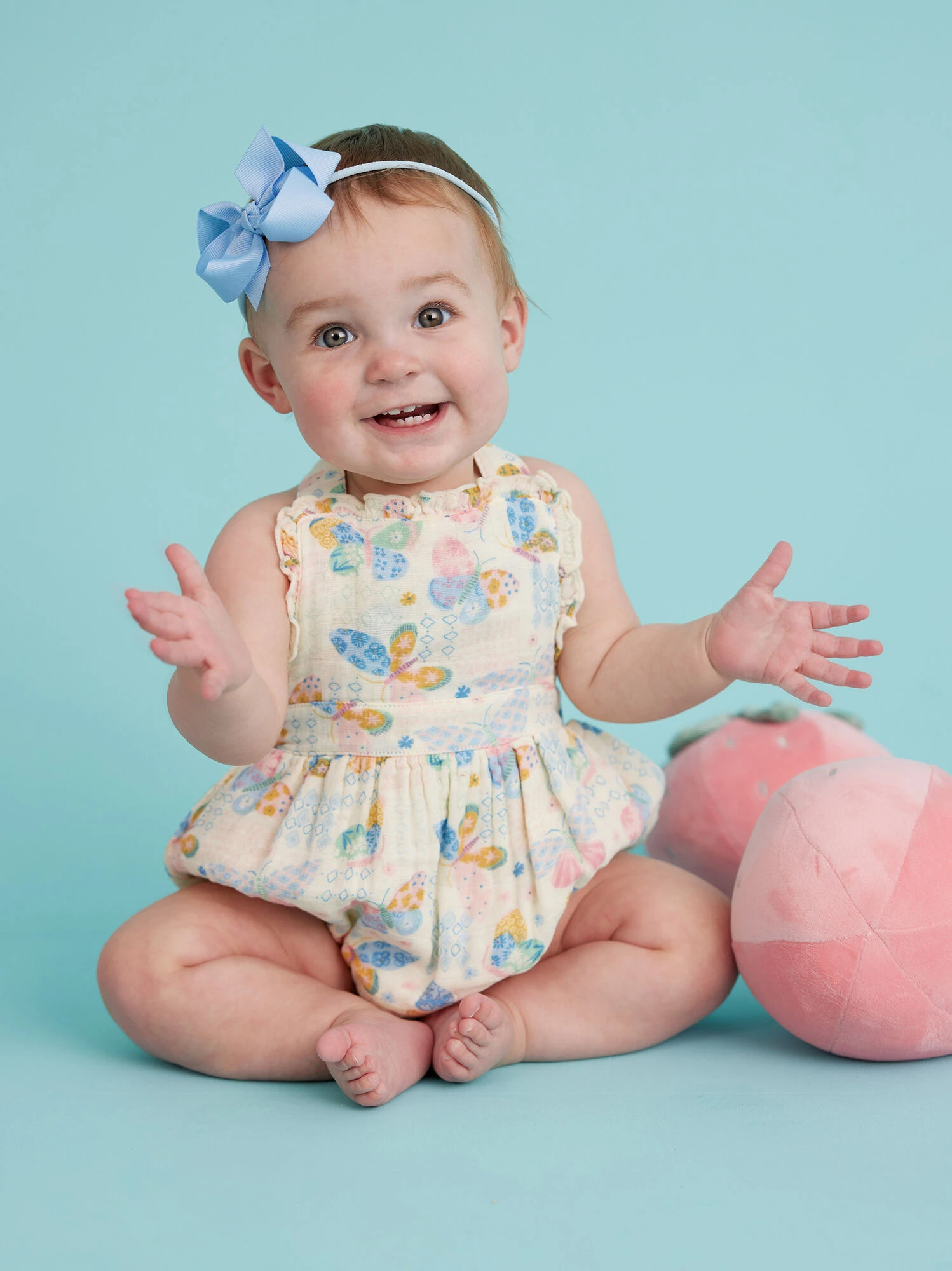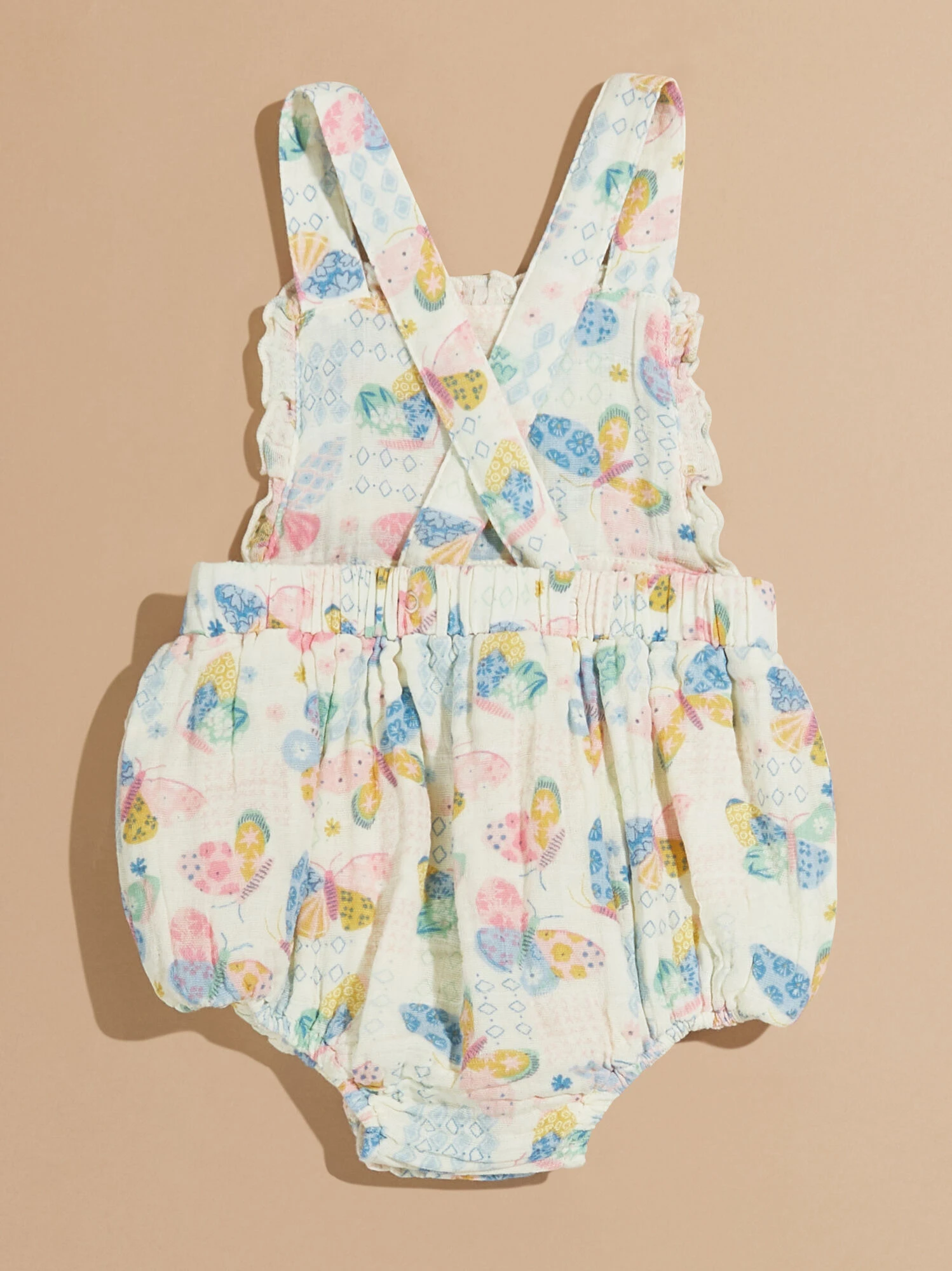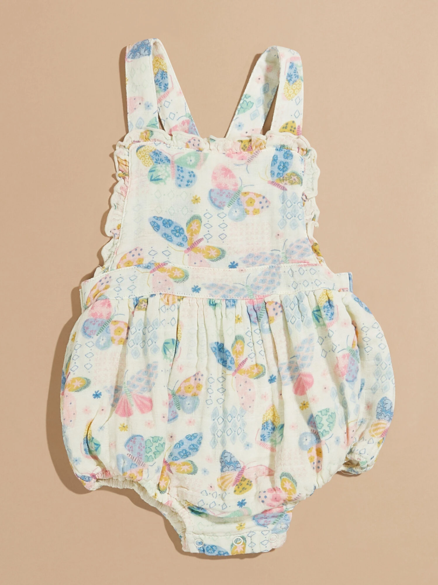 This easy all in one outfit is the cutest pick for your girl featuring a butterfly inspired print with a vintage patch design. The ruffle lined bodice and cross back straps adds an extra touch of style, while the lightweight, eco-friendly material provides a breathable comfort for your babe.
