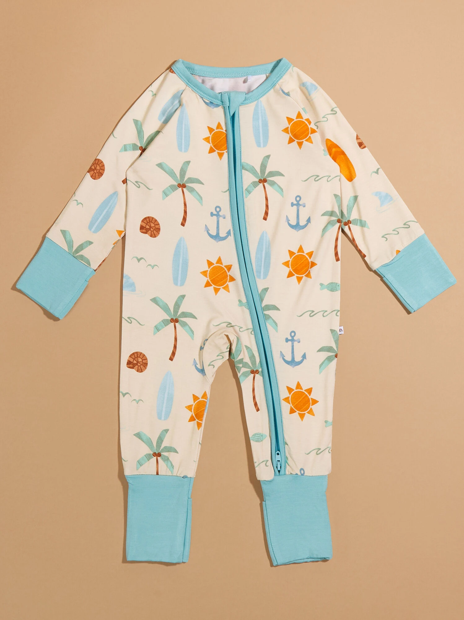 Dive into the ultimate beachy sleeper designed to transport your little into a tropical paradise, where palm trees sway in the breeze and the sun shines bright. This sleeper features surfboards, palm trees, fish, anchors, and waves that will make your babe feeling like their riding the waves even while fast asleep.