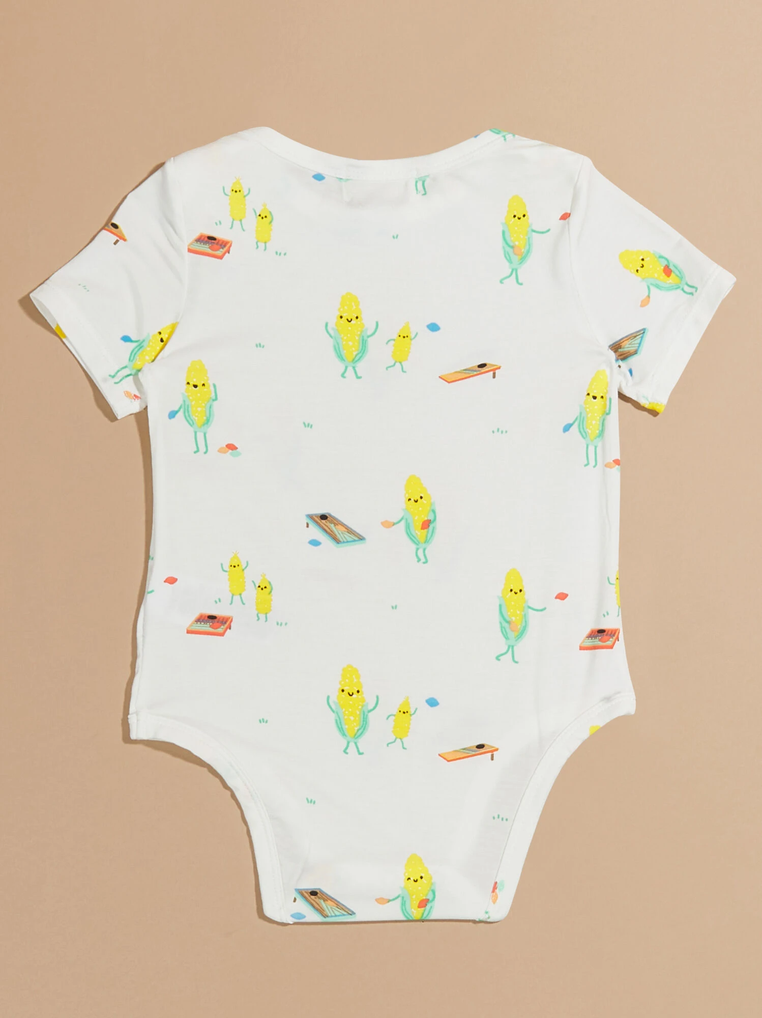 This lightweight one-piece is carefully crafted from ultra soft eco-friendly fabric from bamboo, providing breathable comfort for your babe. The playful cornhole print makes this an adorable, must-have base layer or all in one outfit for your babe.