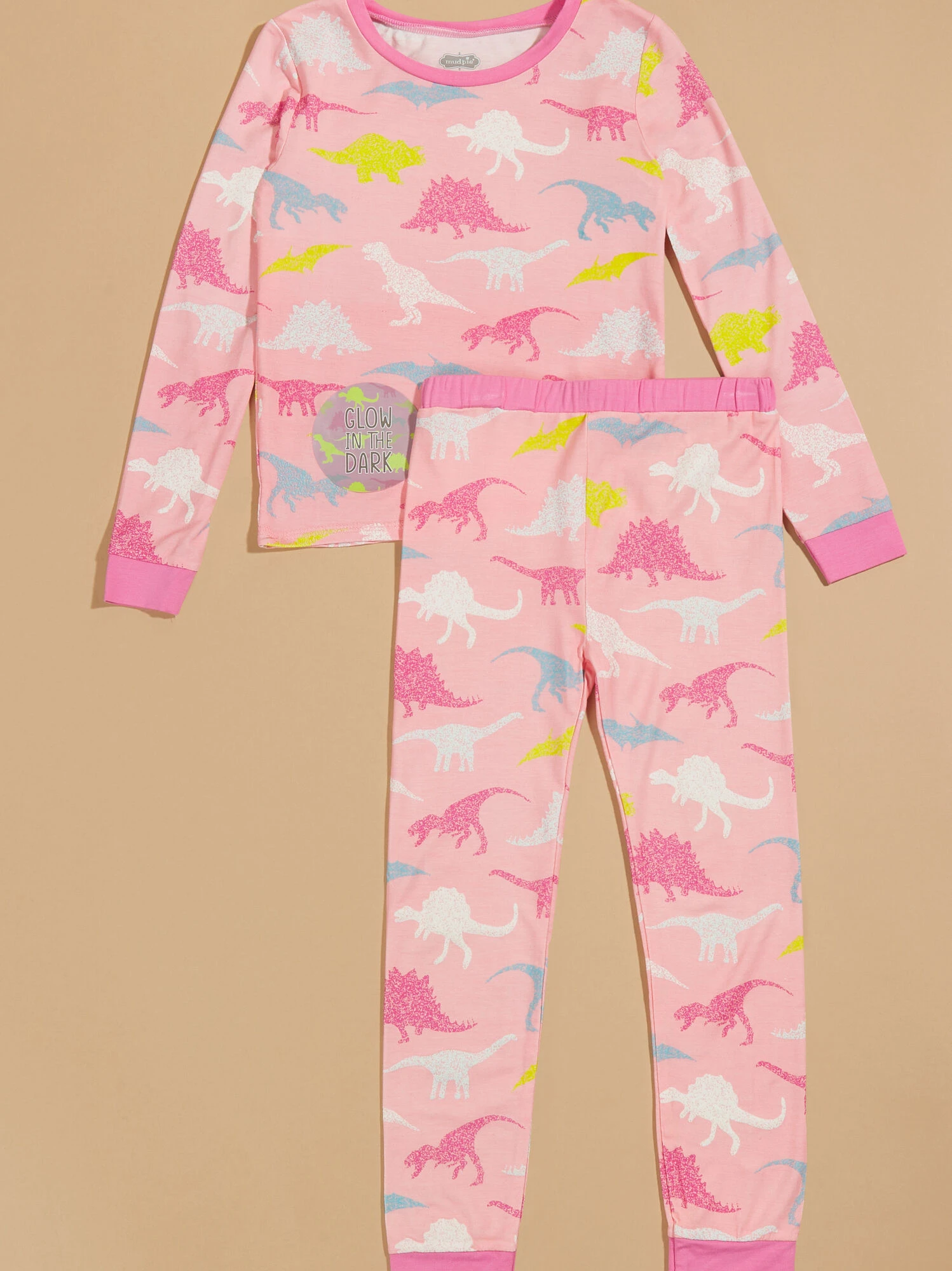 Ignite your littles imagination with this eco-friendly material made from bamboo in this adventurous dino pattern that glows in the dark! This set features a trim around the collar, hand cuffs, ankle cuffs, and a stretchy fabric to let your little be on the go.