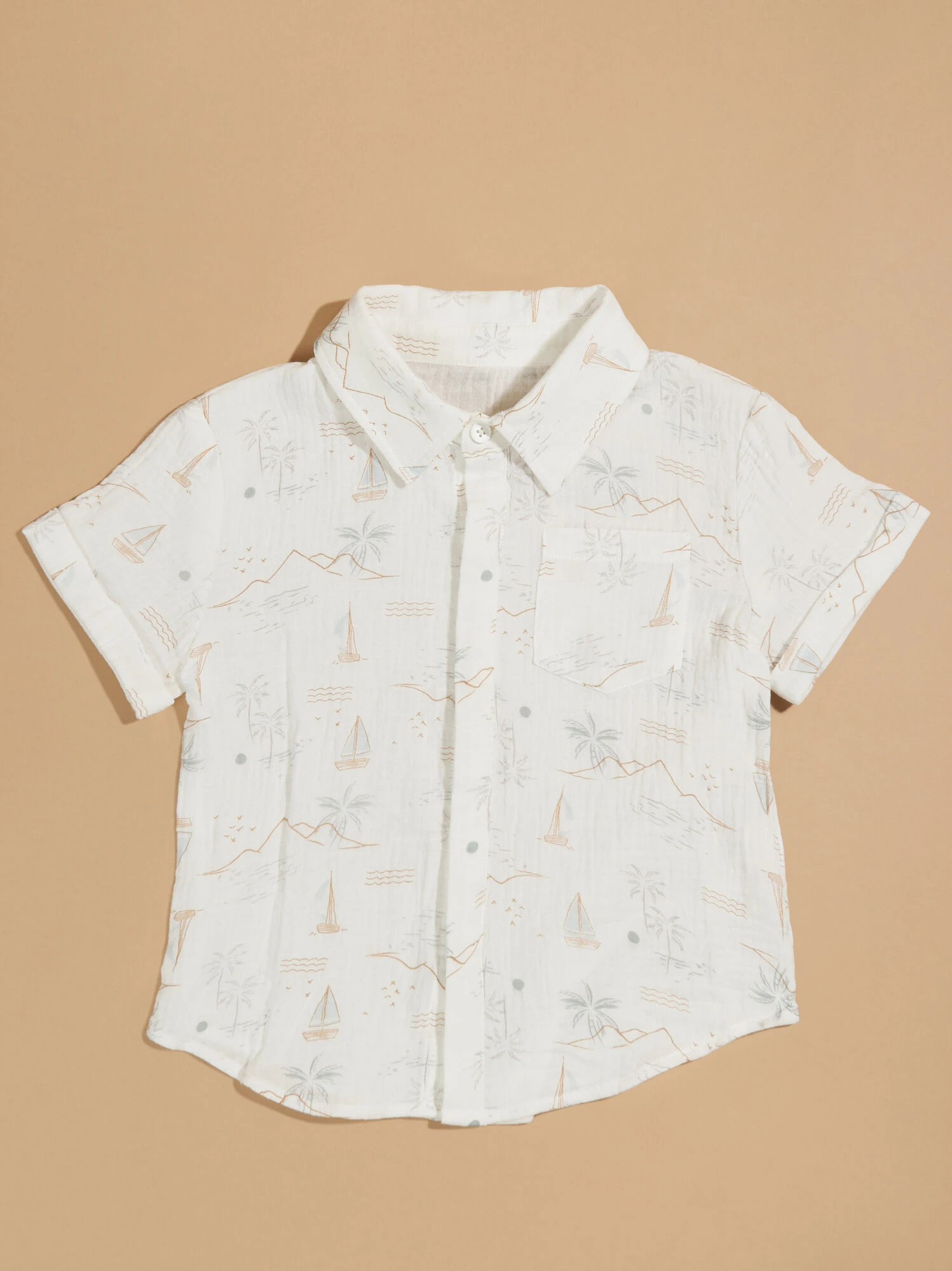 This cute button-down for your mini is adorned with a charming boat print in a classic collared neckline style, perfect for nautical-themed adventures. With snapped buttons and made from breathable material, it’s not only stylish but also ensures comfort and ease for your little sailor’s day out!