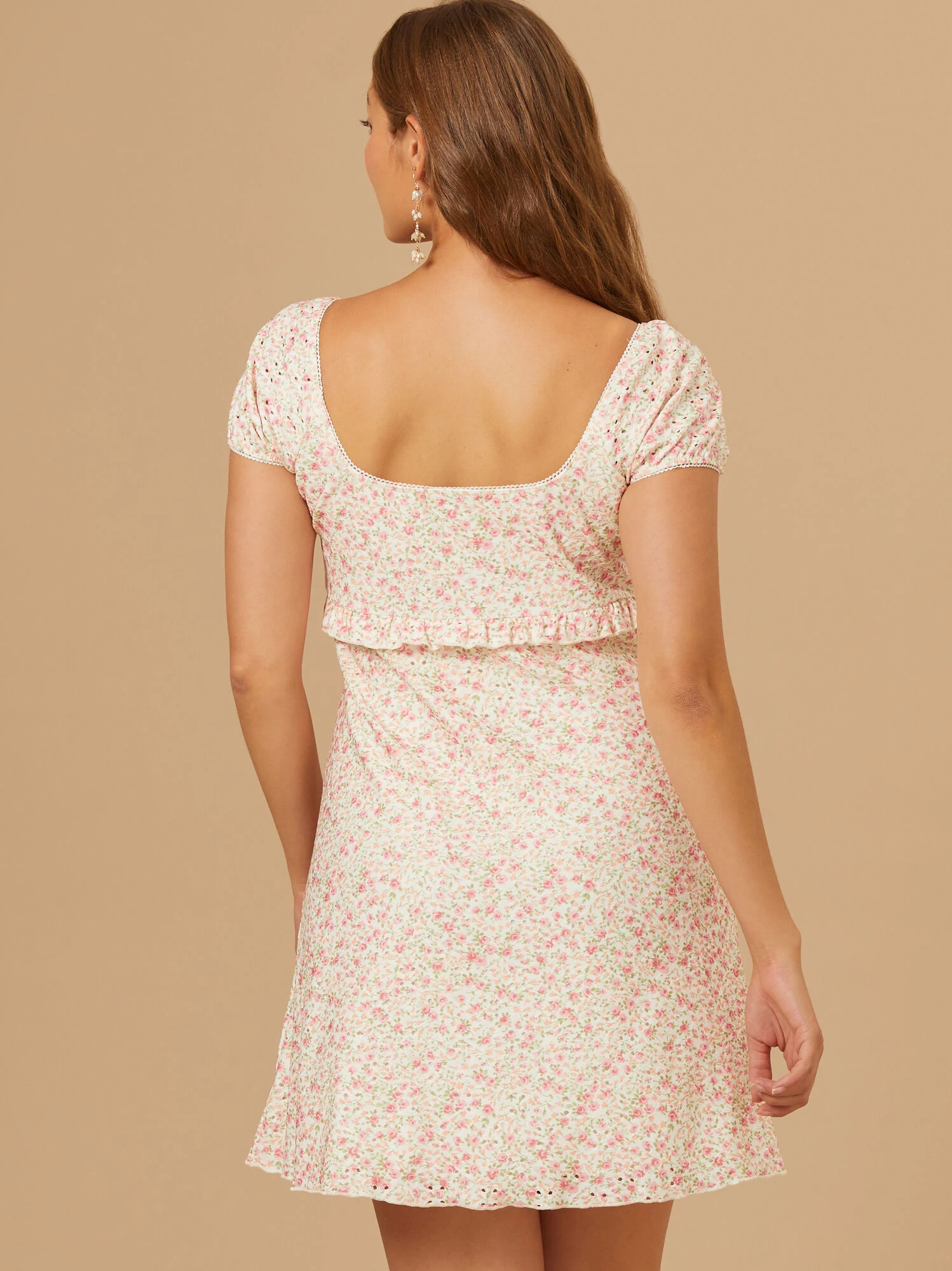 This dress guarantees effortless elegance with the dainty floral print, ruffle waistline and eyelet fabrication. The buttery soft lining ensures maximum comfort, while the scoop neckline with a lace trim and small puff sleeves give this outfit a sweet charm you will love for a summer outing.