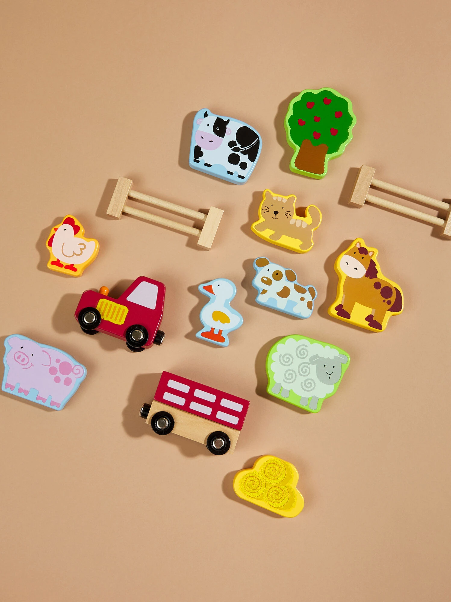 Explore all the animals in the farm with this MudPie barnyard play box set. This sixteen wooden animal piece set opens up a fun world of imagination in the cardboard barnyard box. Take this play set on the go with an easy loop handle on top and play with animals such as a cow, pig, horse, duck, chicken, dog, and much more.