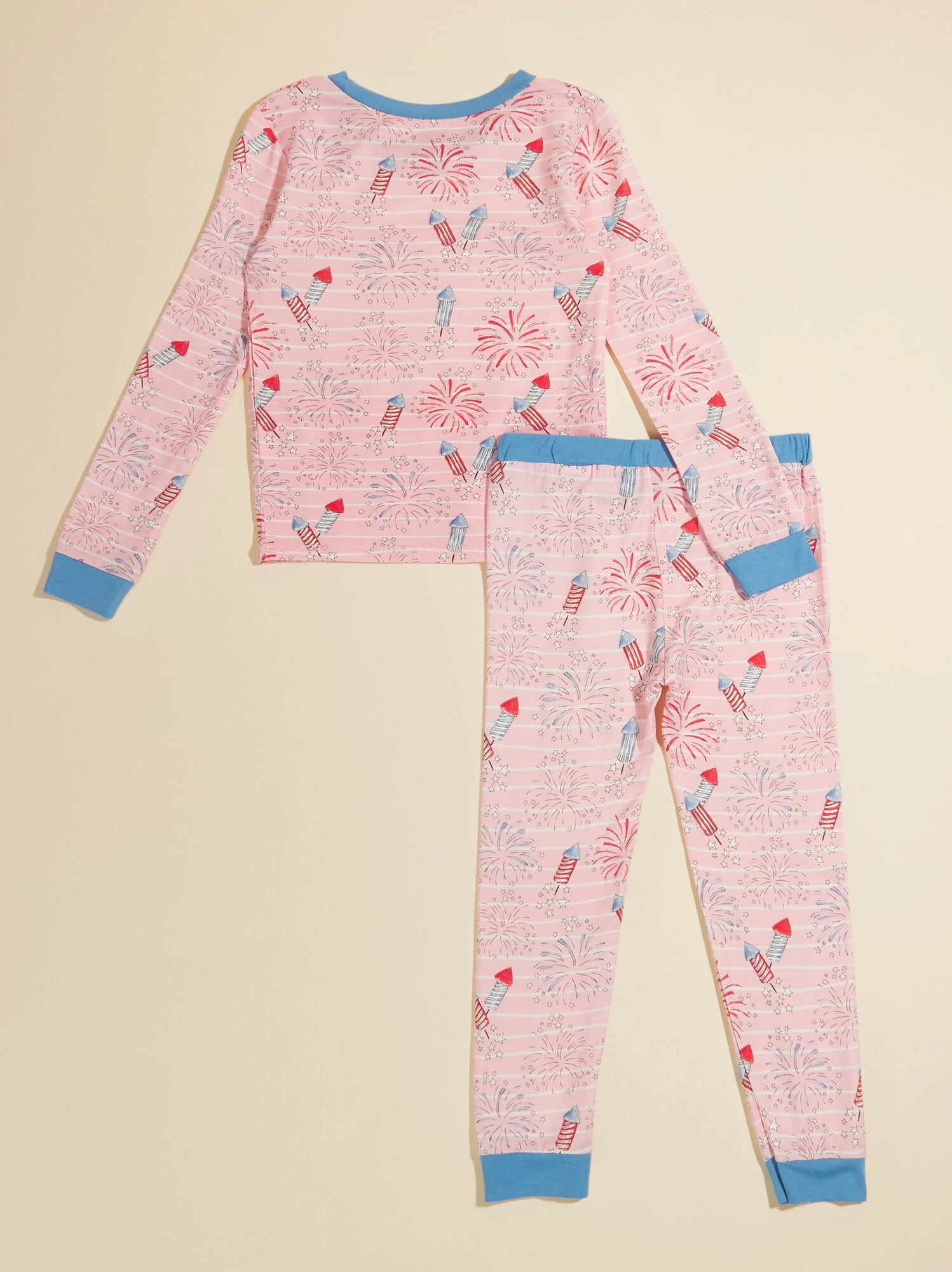 Add some festive fun to your little’s Fourth of July celebration with this eco-friendly bamboo lounge set, featuring a dazzling fireworks print that glows in the dark! Crafted with sustainability in mind, this cozy set not only radiates patriotic charm but also offers a touch of magic as it lights up.