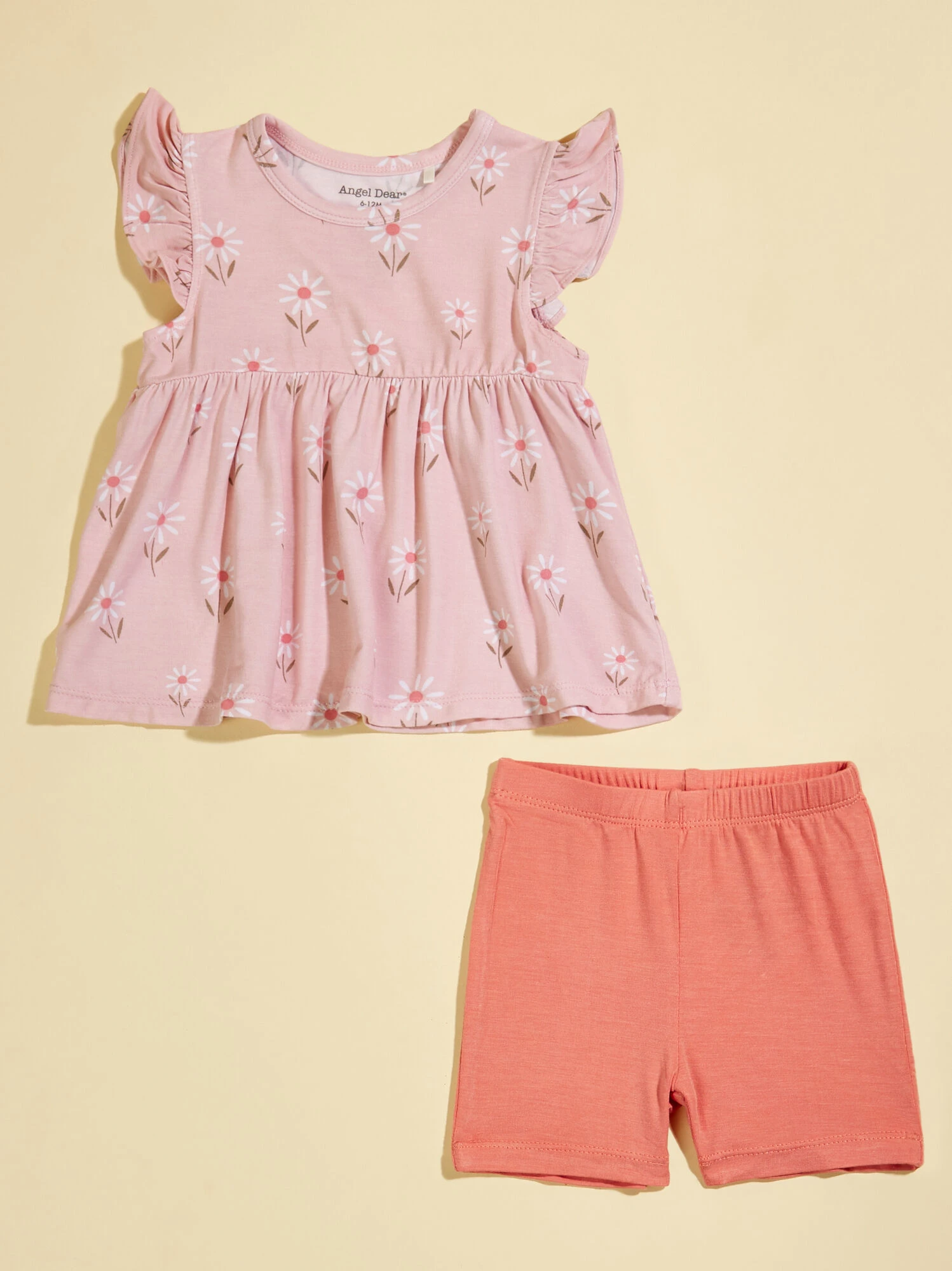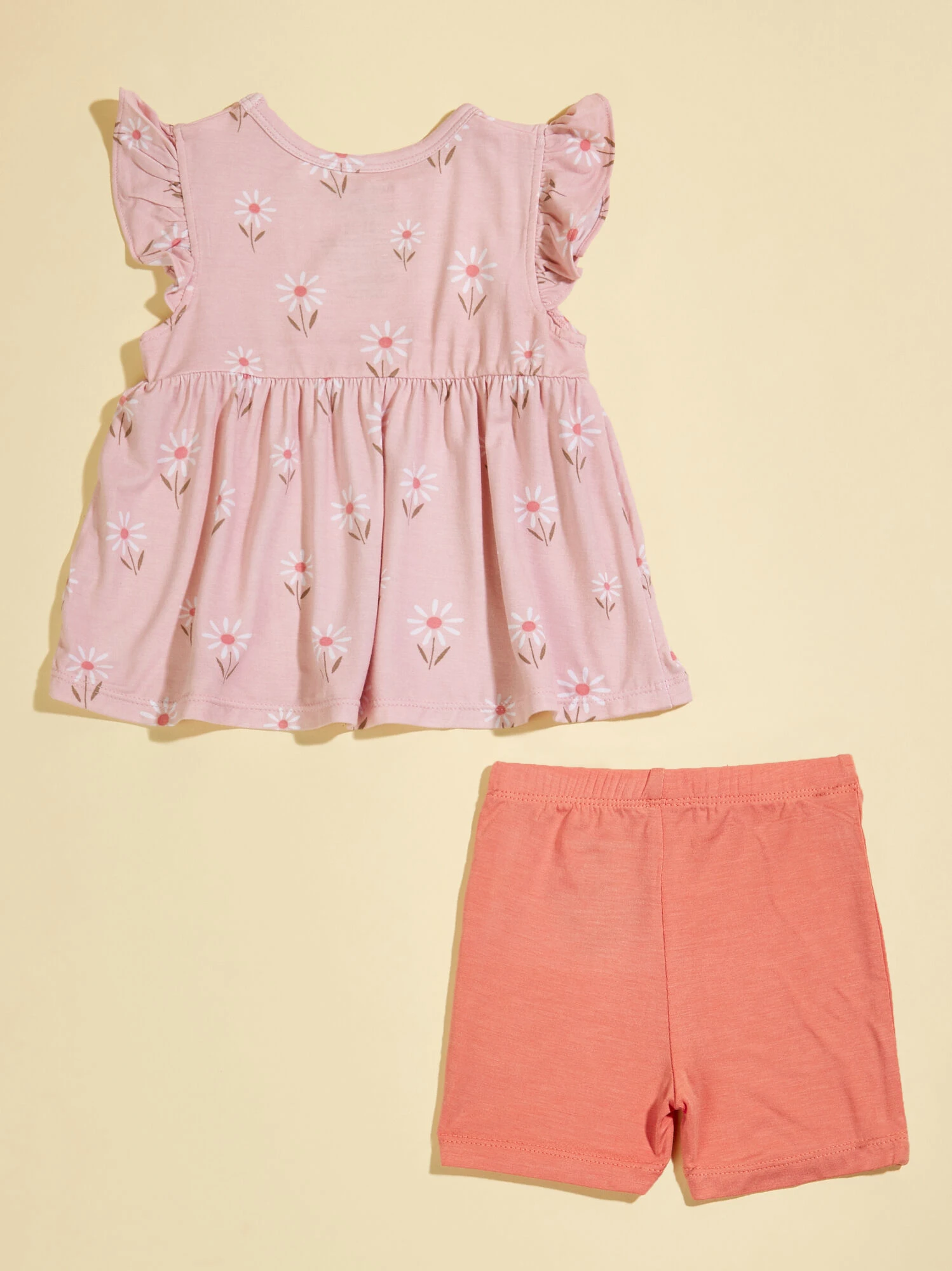 This must have precious daisy print set is the perfect addition to this seasons wardrobe. Crafted with our eco-friendly material from bamboo your babe will stay comfortable all day long, while ruffle sleeve on the tank style and trim around the waist offer a flowy fit over the softest shorts.