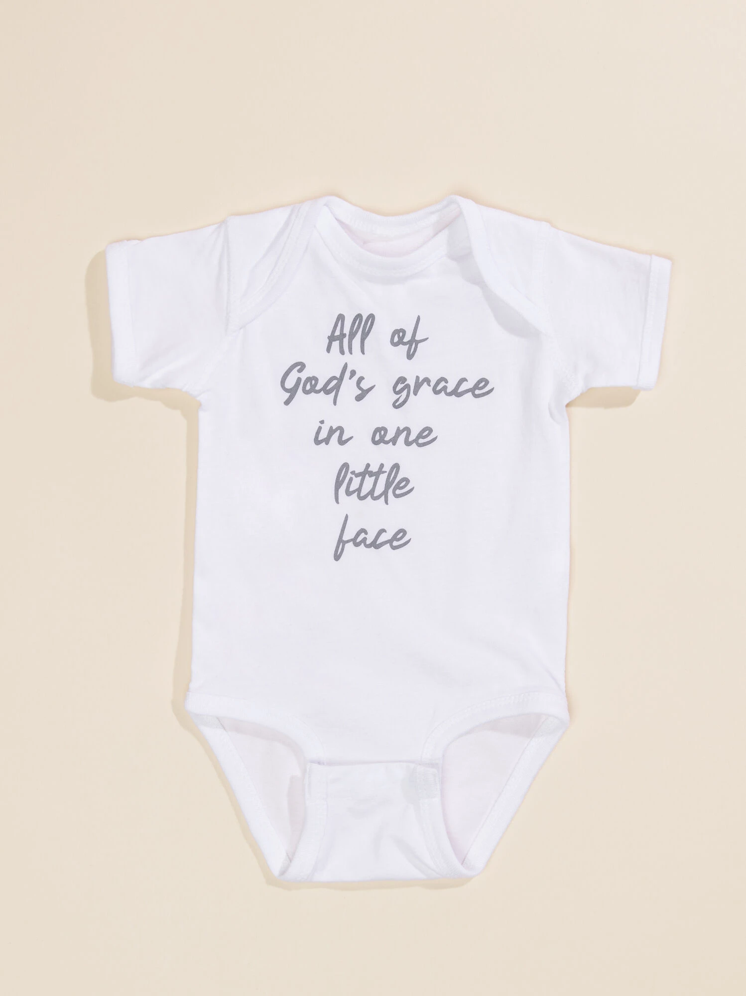 One of God’s greatest gifts to us is the gift of our little one and just how big of a reflection they are of God! This onesie says “All of God’s grace in one little face” – and we just love it!