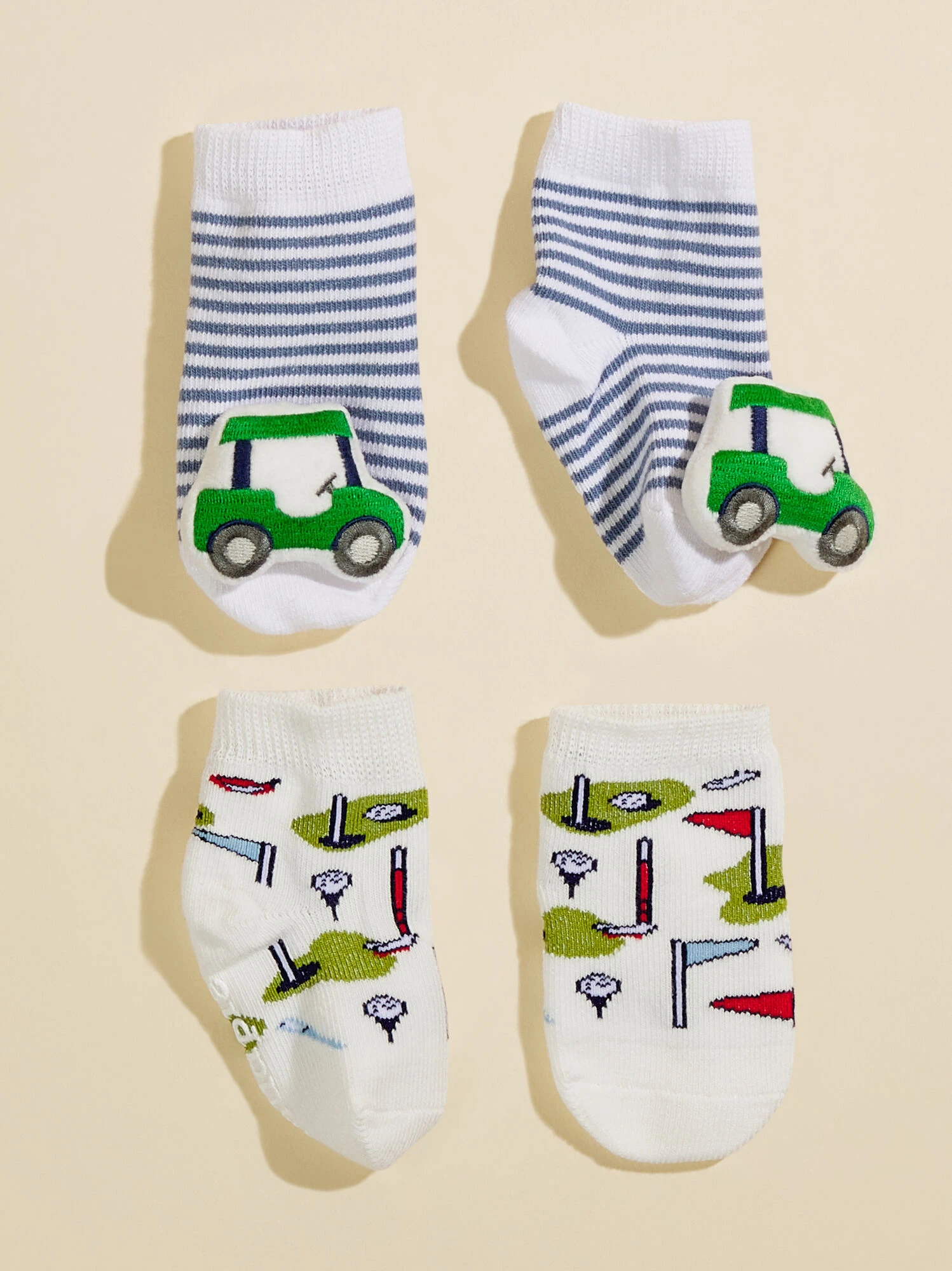 Discover our adorable sock set for your little one, featuring a golf pattern on one pair and playful stripes with a golf cart rattle attached to the toe on the other. Crafted with soft and cozy materials, these socks ensure your babe’s comfort all day long.