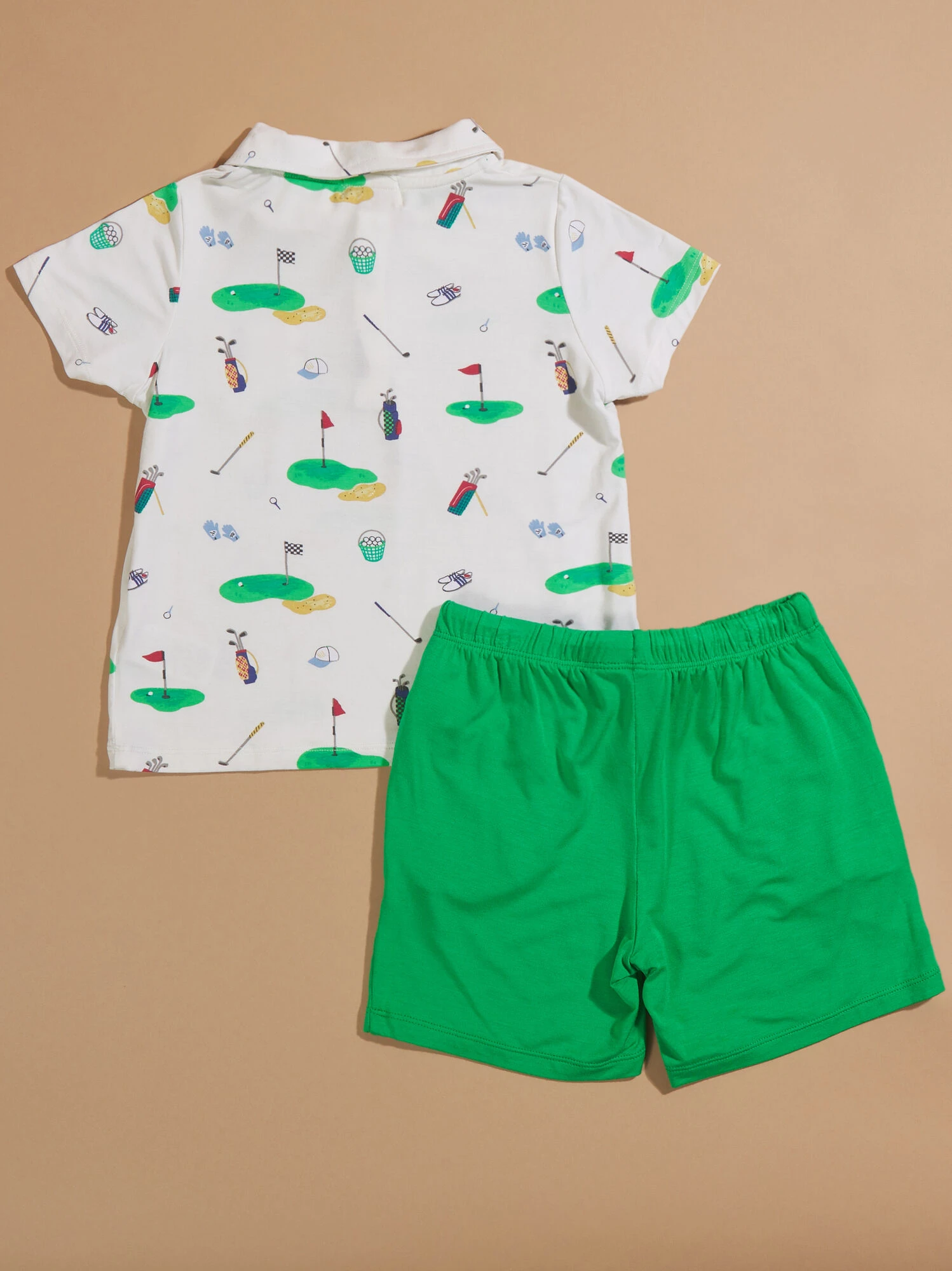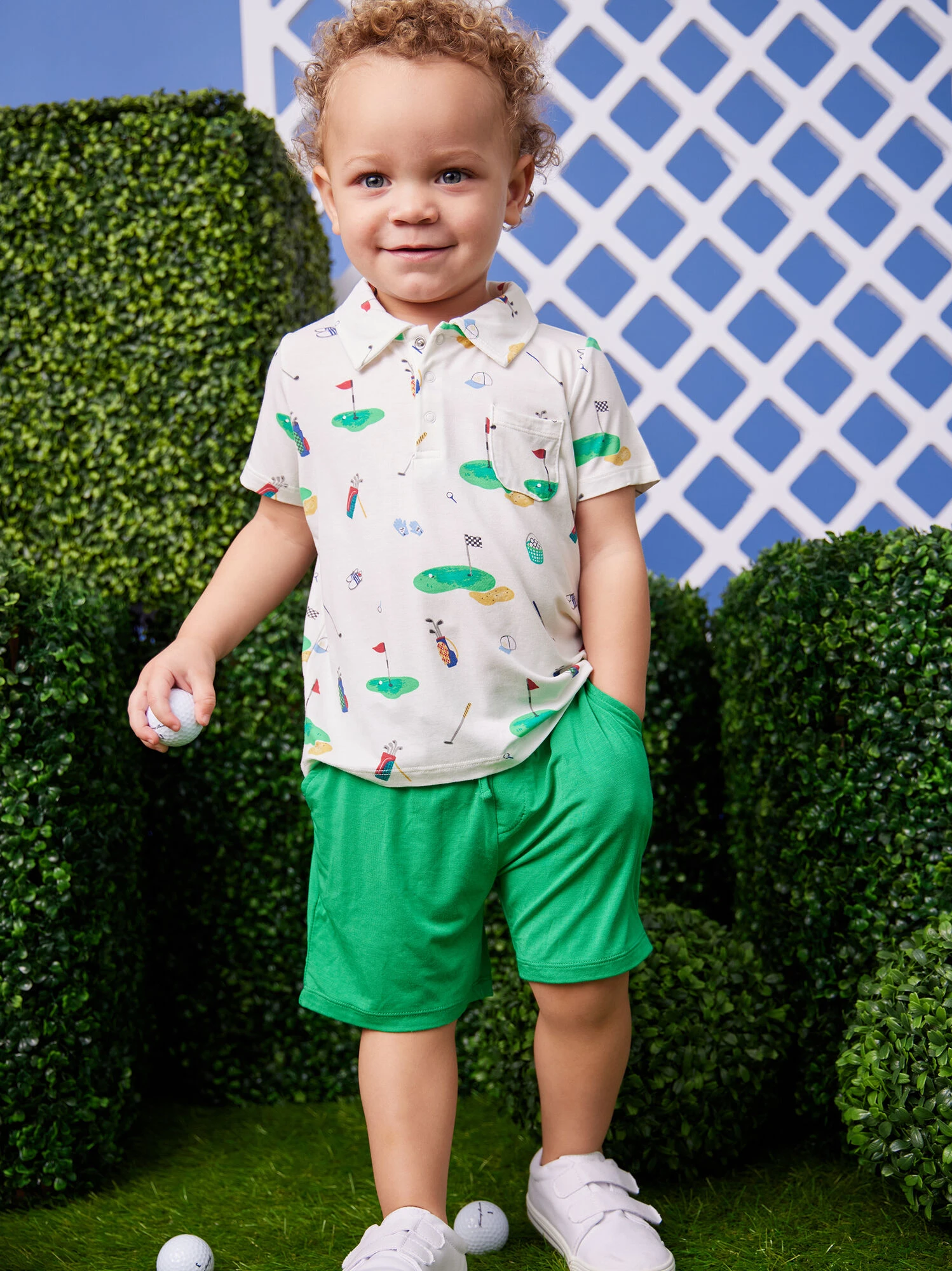This adorable golf polo set is crafted from soft, eco-friendly fabric, ensuring your little one stays comfortable while sporting a classic look. The collared shirt features front buttons and a pocket detail, adding a touch of preppy to their ensemble. Paired with drawstring waist lounge shorts, it’s the perfect combination of style and comfort for your tiny golfer.