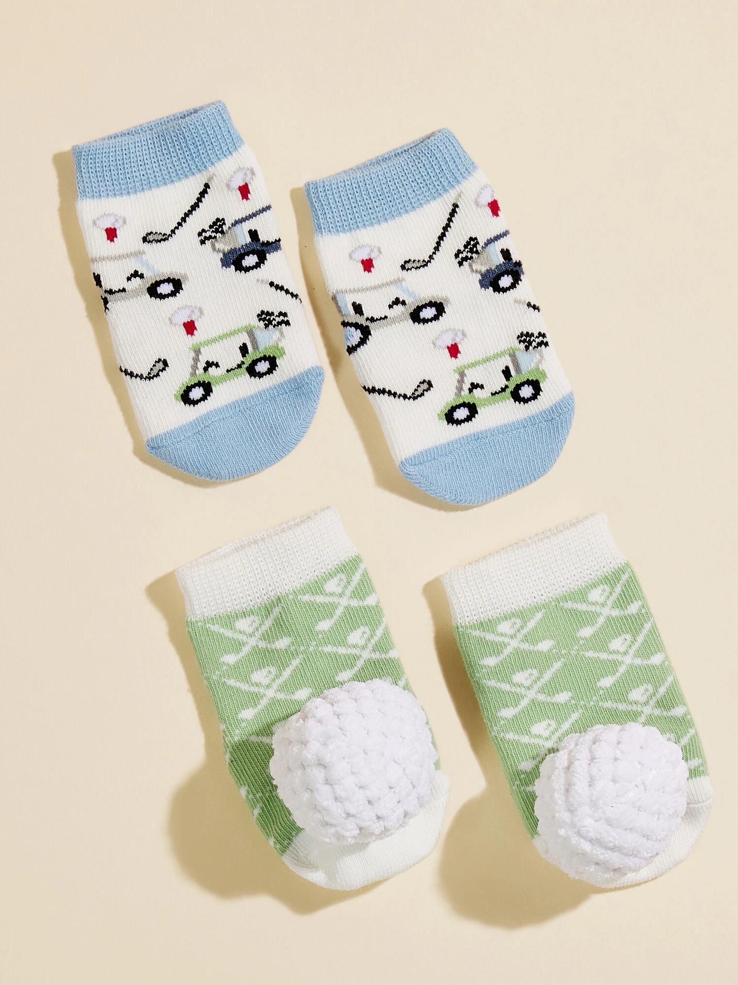 These socks are a delightful and cozy addition to your babe’s outfit, crafted from a soft and stretchy material. The set includes two pairs of socks, one showcasing dimensional rattles on the toes, bringing a playful element to this golf inspired accessory.