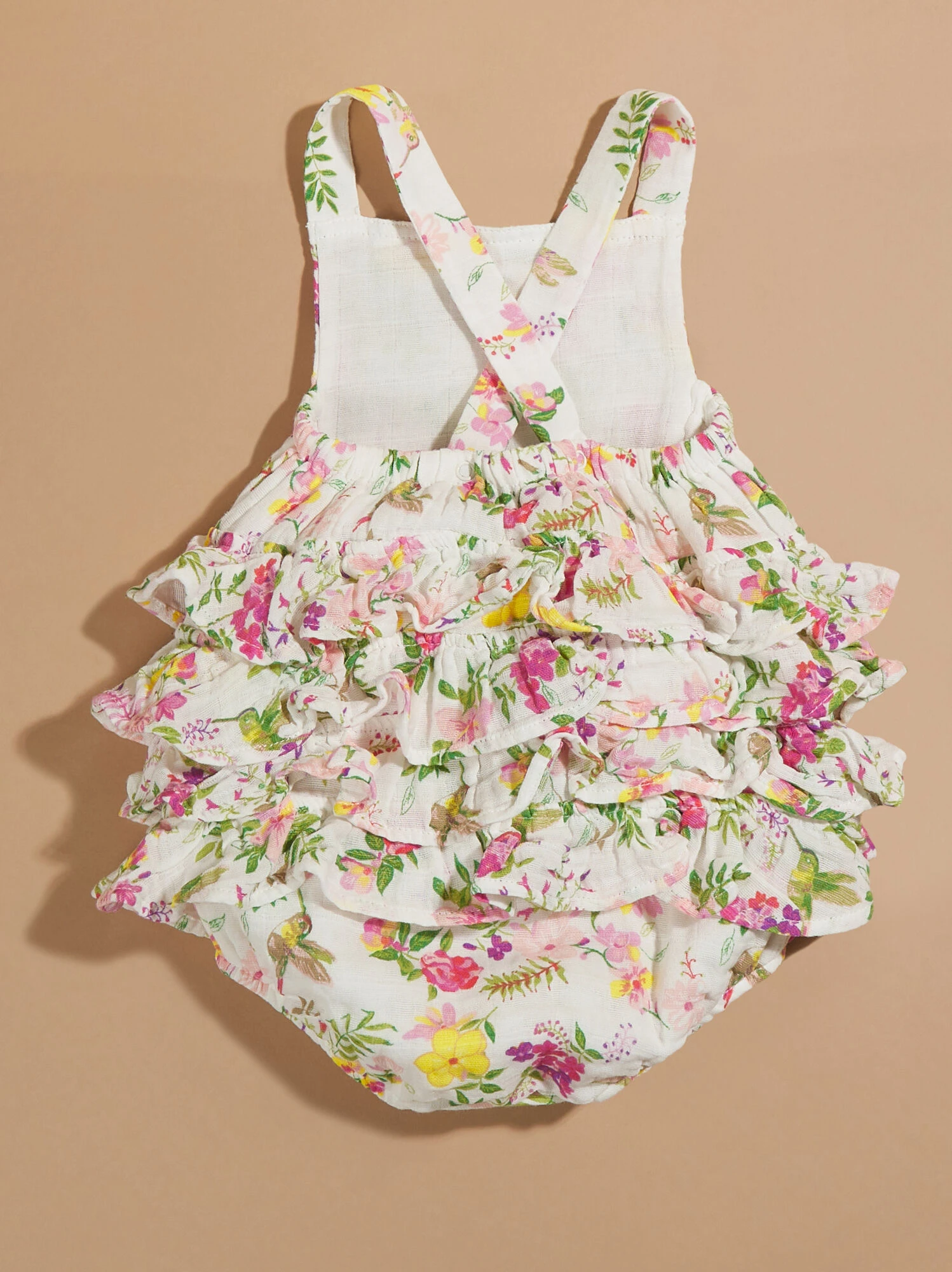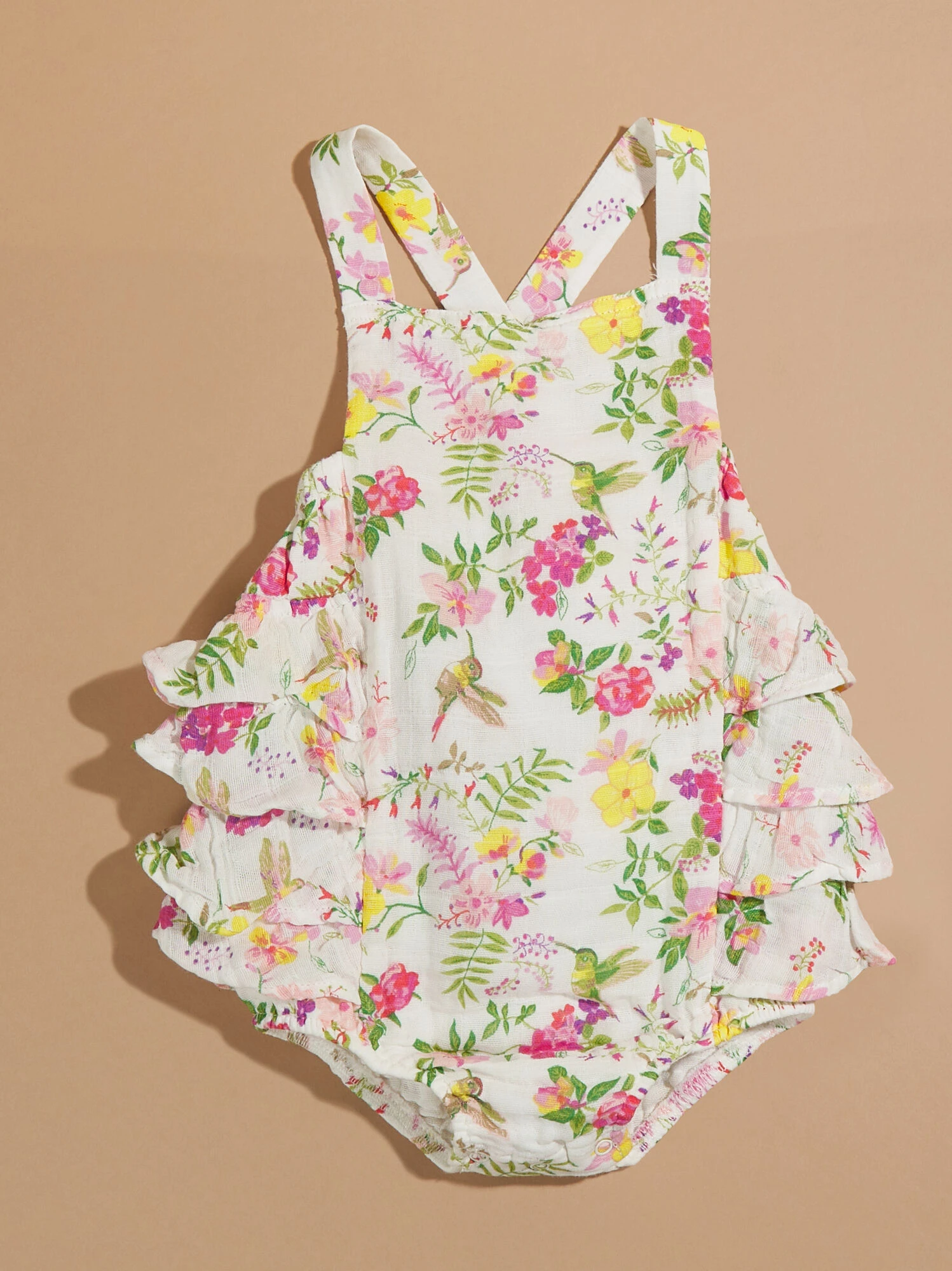 This charming bubble introduces playful prints and delightful ruffled detailing to your little one’s style. The cross-back straps add an adorable look with multiple snaps for an adjustable fit. Crafted from eco-friendly bamboo material, let your babe play in comfort all day long, perfect for the sunny seasons.