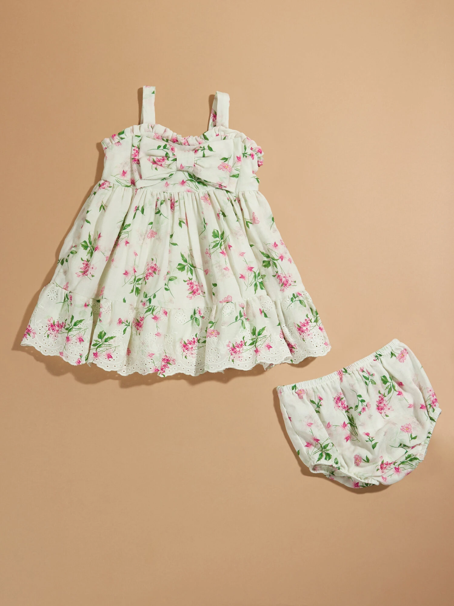 Dress your girl in this elegant look featuring a floral dress with a ruffle lined neckline, lace hem, and bow front design, paired with a matching bloomer. The gathered waistline offers a flowy fit, while the lightweight lining provides breathable comfort for your little one.