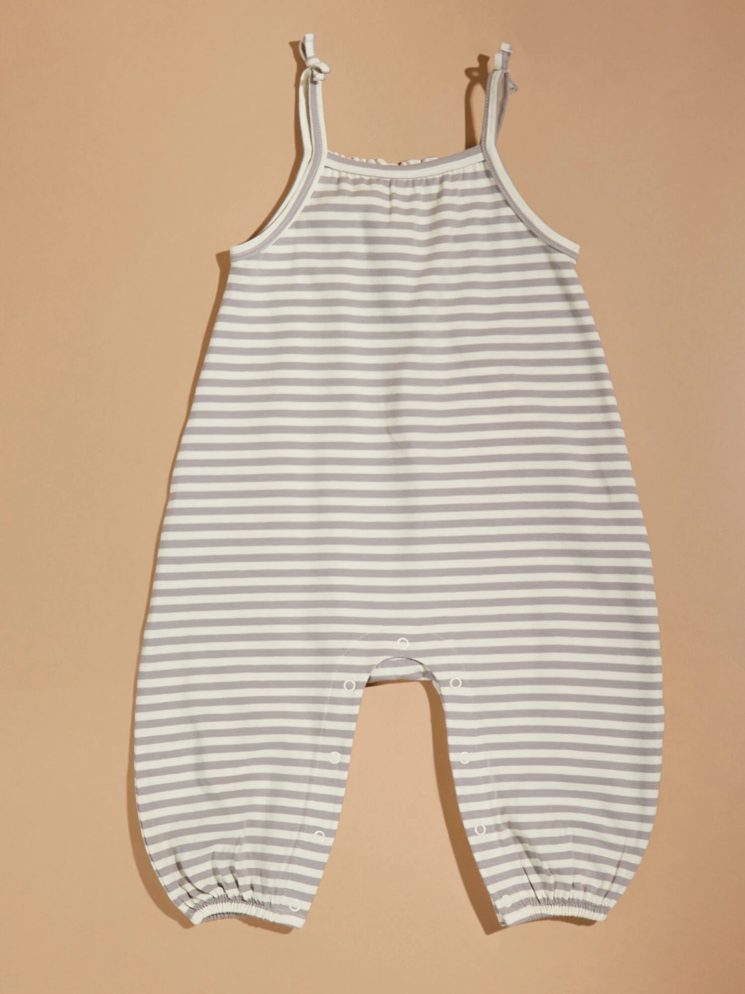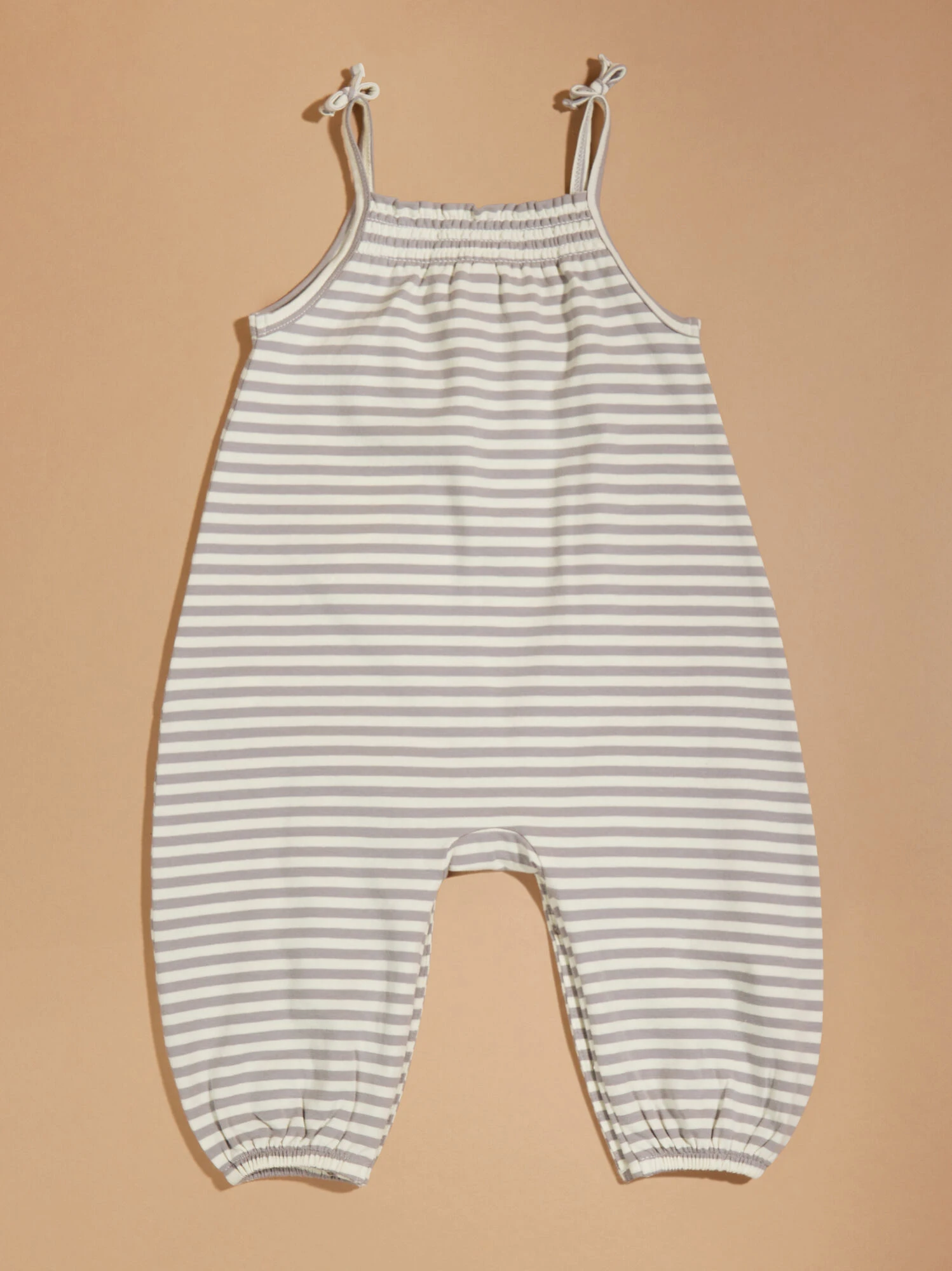 This jumpsuit for your mini is simplistic and stylish with a classic striped print, fixed tie details on the straps, and convenient snapped closures. The smocked back and buttery smooth organic fabric offers the soft stretch and gentle feel against the skin that your little one needs.