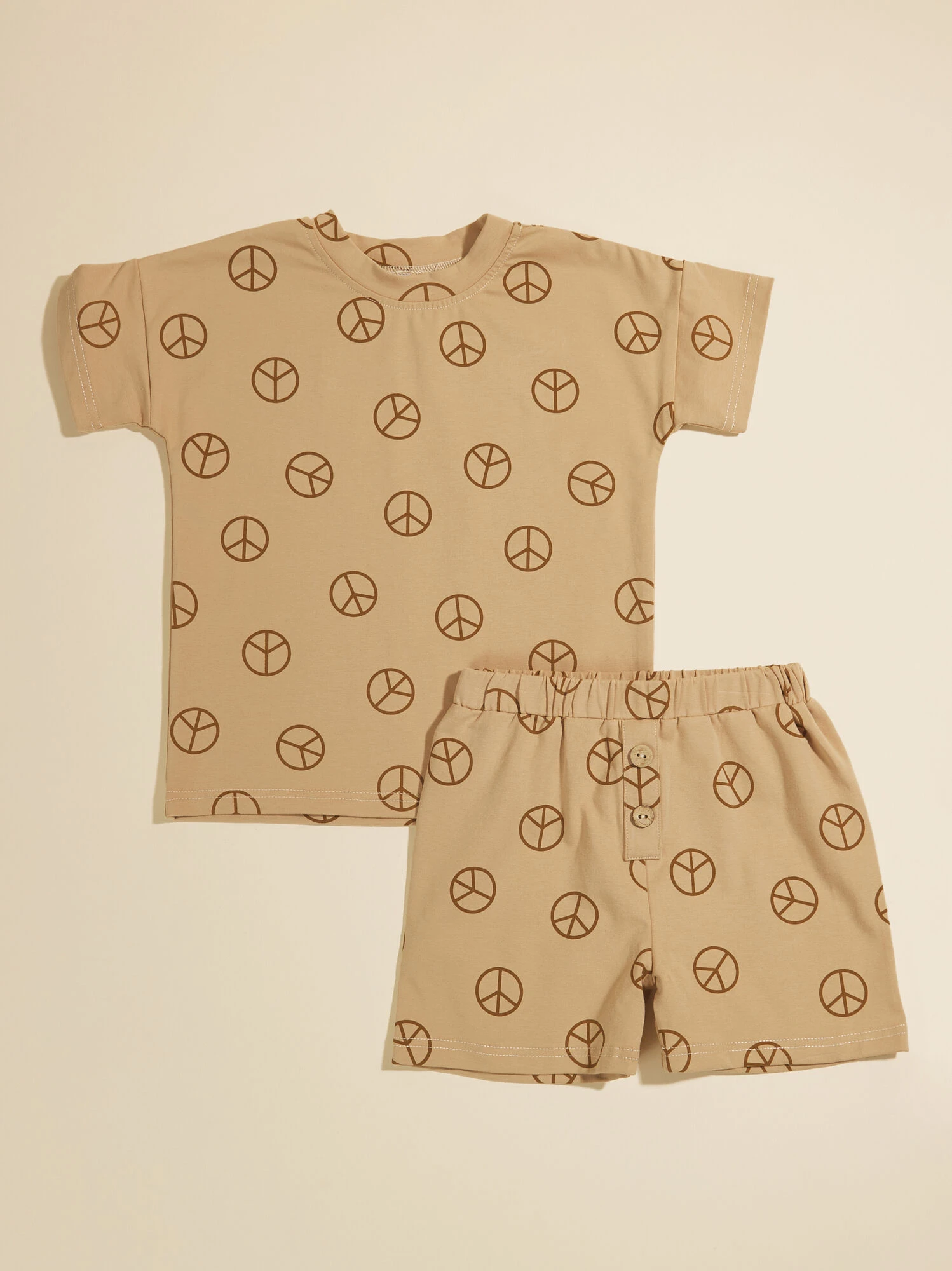 Your little is sure to stay effortlessly cozy in this matching set featuring shorts with a two button detail and a classic crewneck tee. The buttery soft material offers lightweight breathability for all day comfort during playtime, while the peace sign print offers a relaxed, in style look.