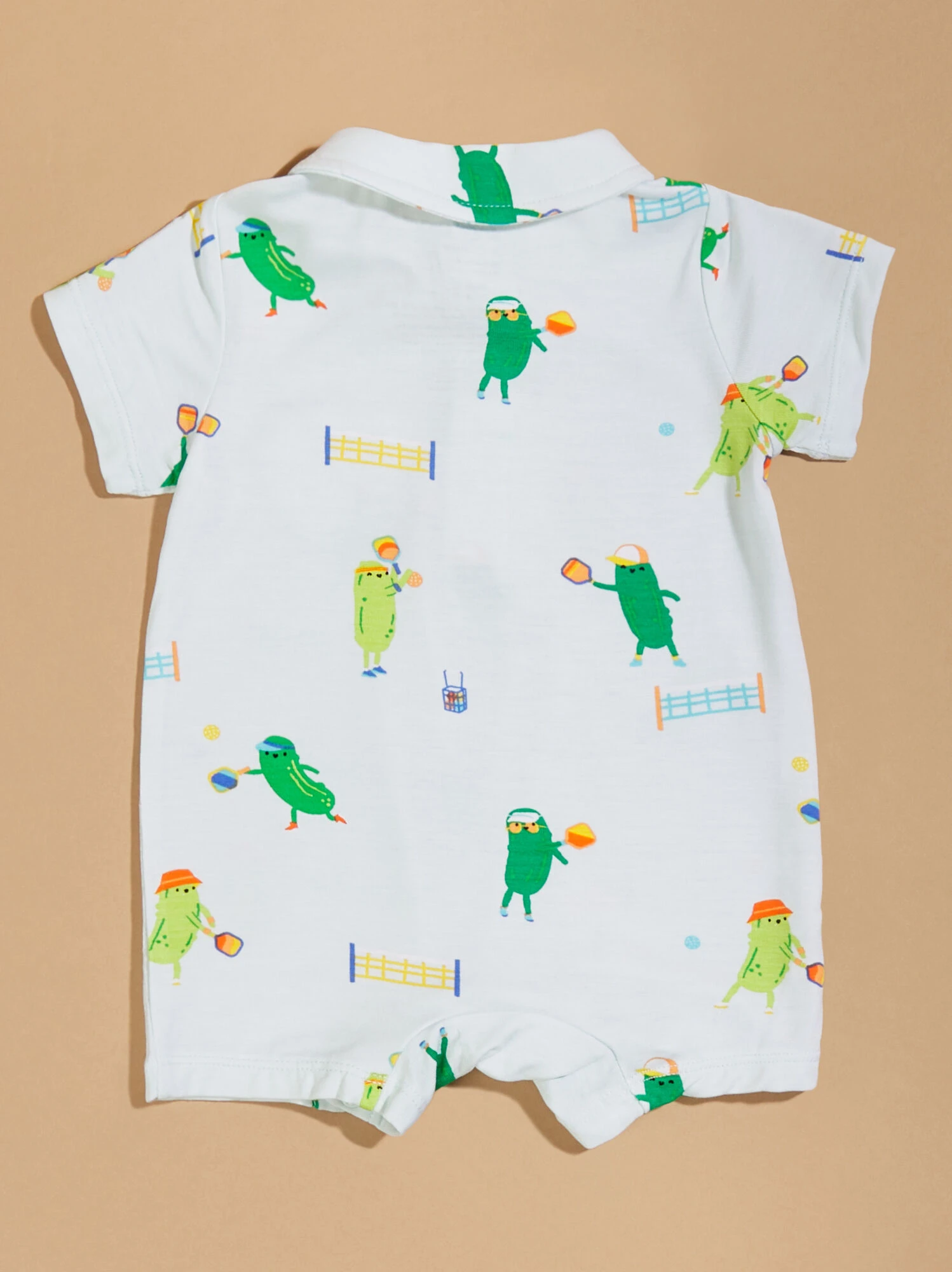 This adorable jumper features charming pickleball inspired designs, adding a sporty touch to your little one’s wardrobe. The eco-friendly bamboo material provides buttery soft comfort, while the convenient front pocket and preppy collared neckline, make this one-piece the cutest look for outings or lounging at home.