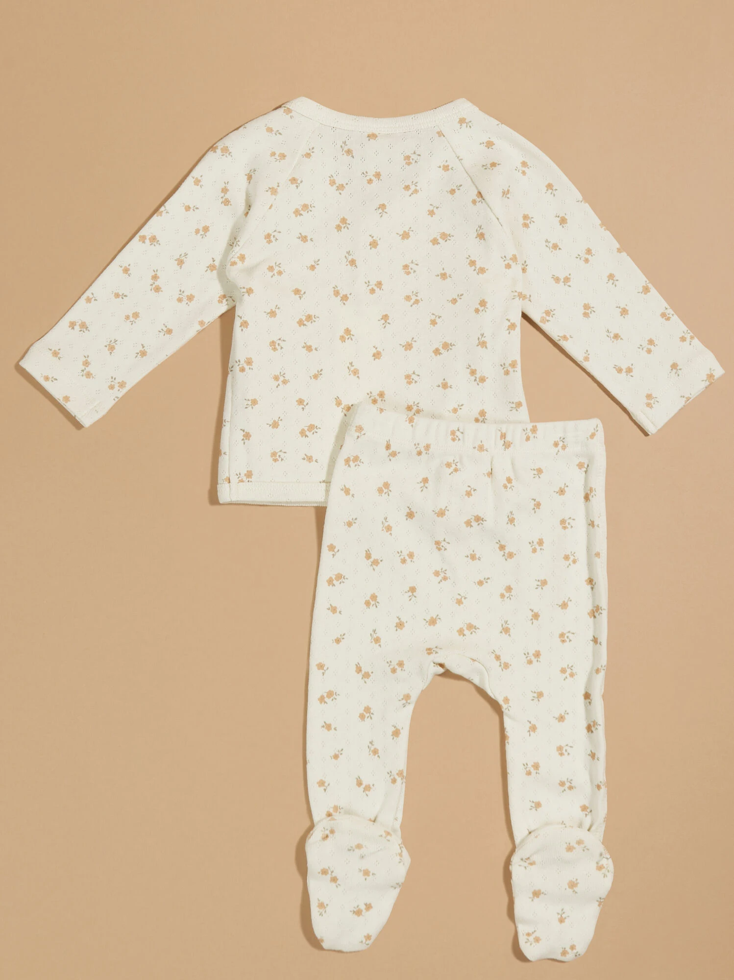 Elevate your babe’s wardrobe with this adorable pointelle set including a long sleeved top in a wrap design and footed pants. The top features delicate button detailing and a convenient snap closure for easy dressing, while the matching pants provide an elasticized waist, sure to keep your little one cozy and stylish from top to toe.