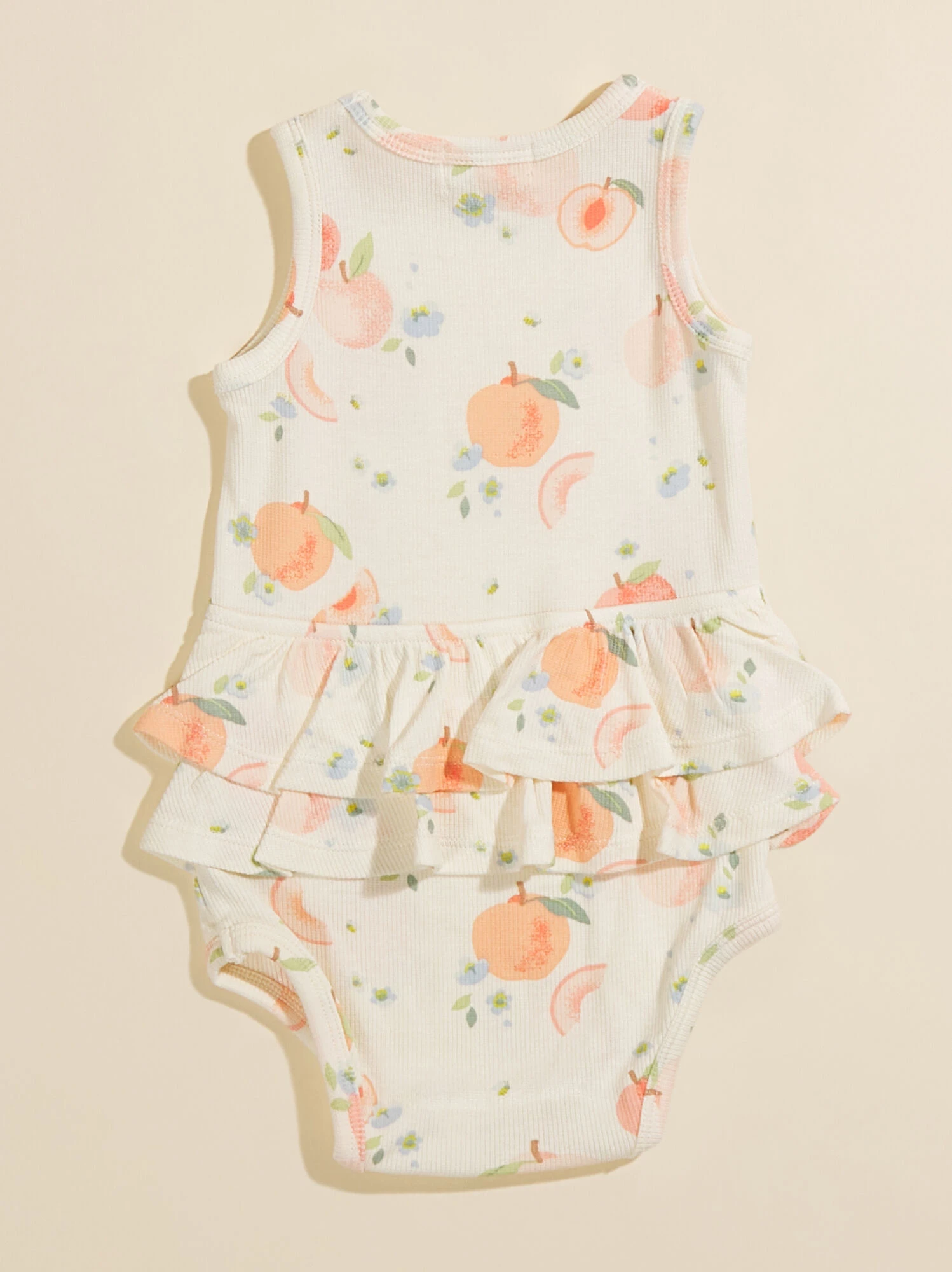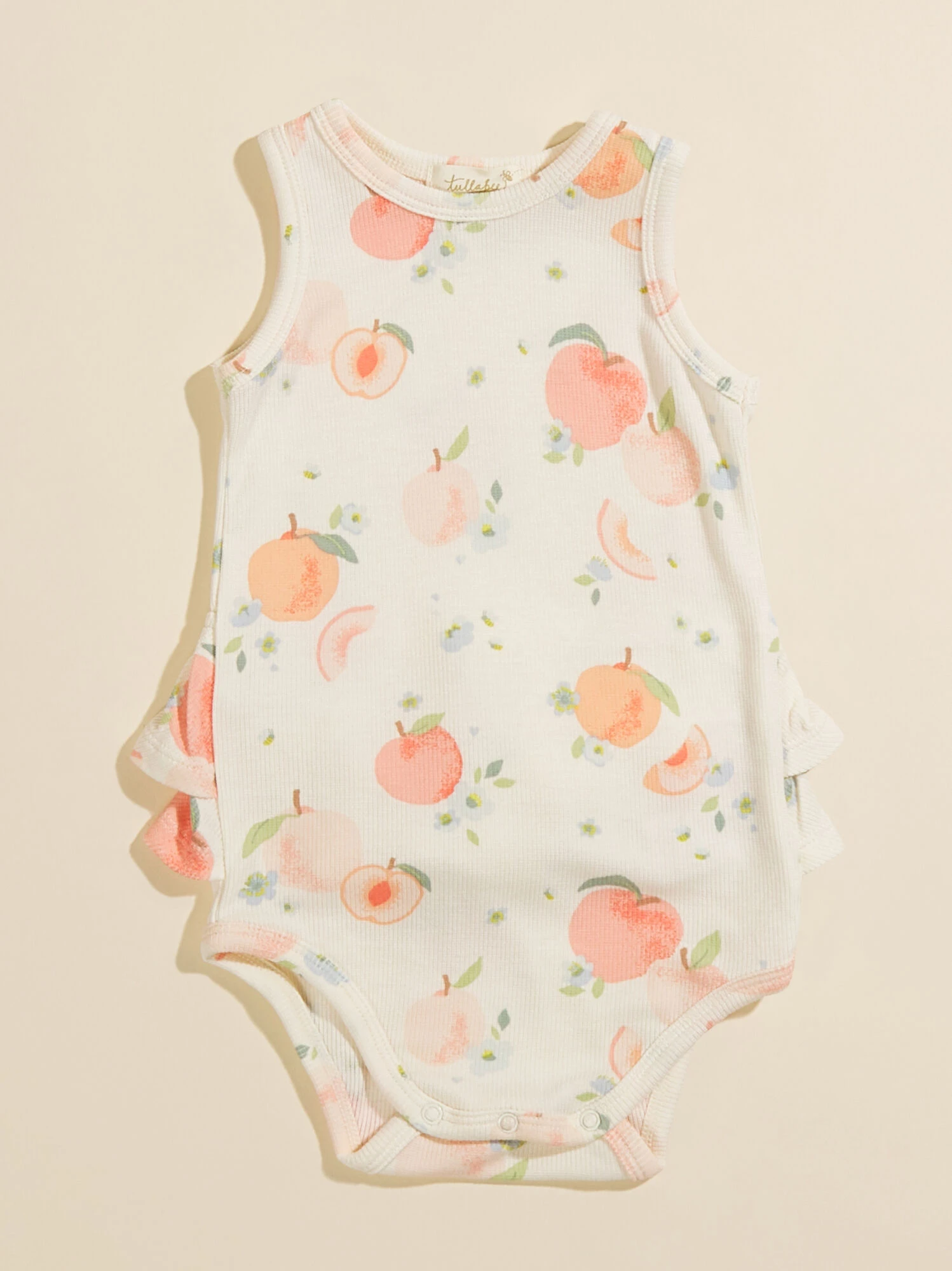 Designed with a peach pattern and adorable ruffles, this bodysuit adds a touch of sweetness to your babe’s wardrobe. It is made from eco-friendly materials, providing a sustainable and comfortable choice for your little one. The convenient snap closure ensures easy and quick changes, making it a practical and stylish addition to your babe’s collection.