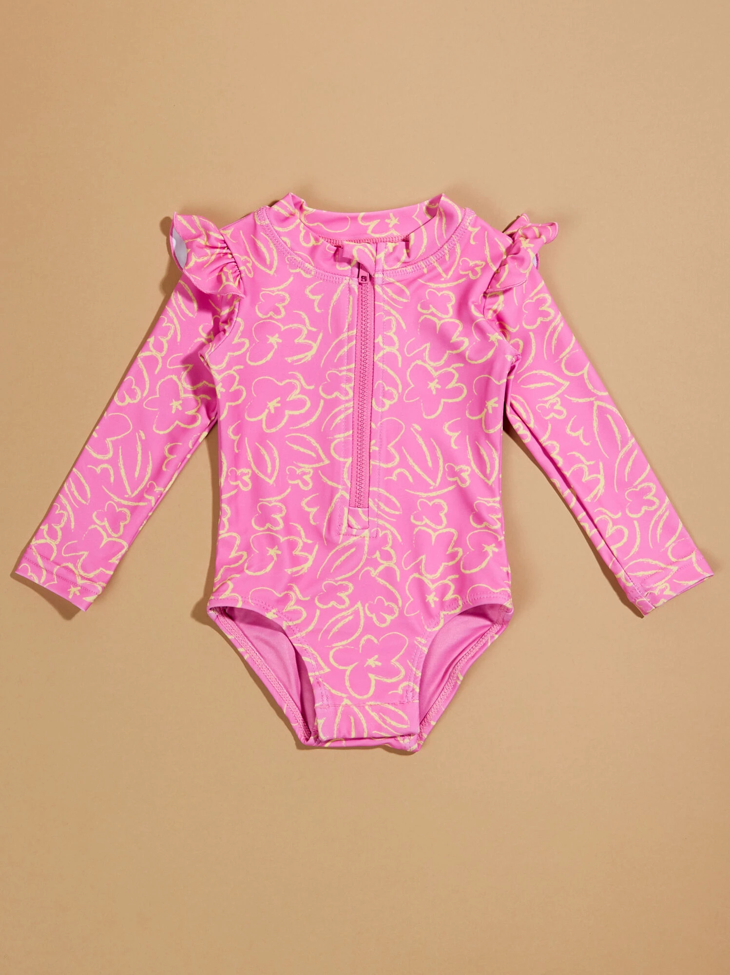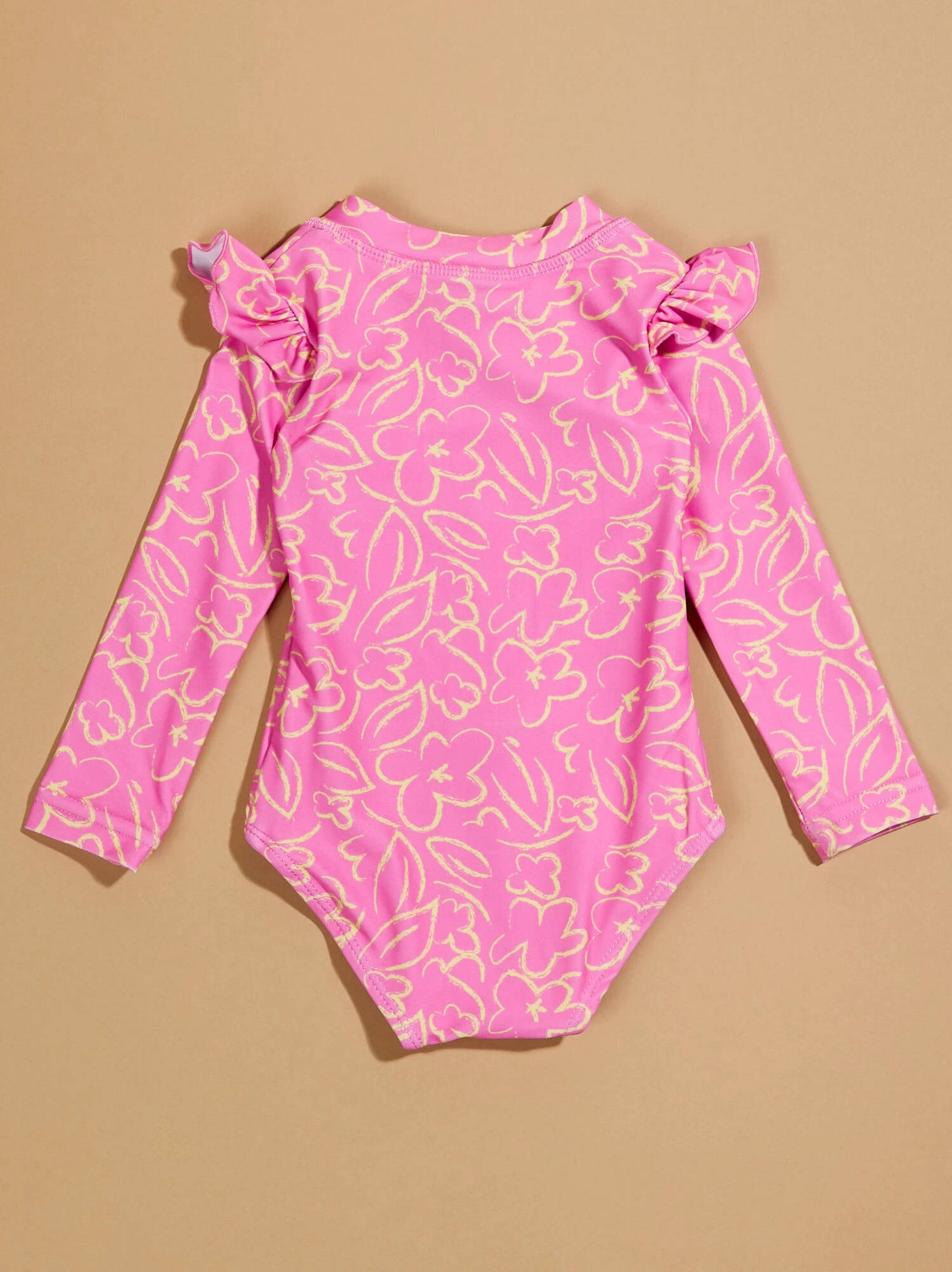 Get your girl ready for a day by the water in this rash guard style swimsuit featuring a floral design, zipper front, and ruffle shoulder detailing. The buttery soft material provides a stretchy feel and ultimate comfort for a day of play in the sun.