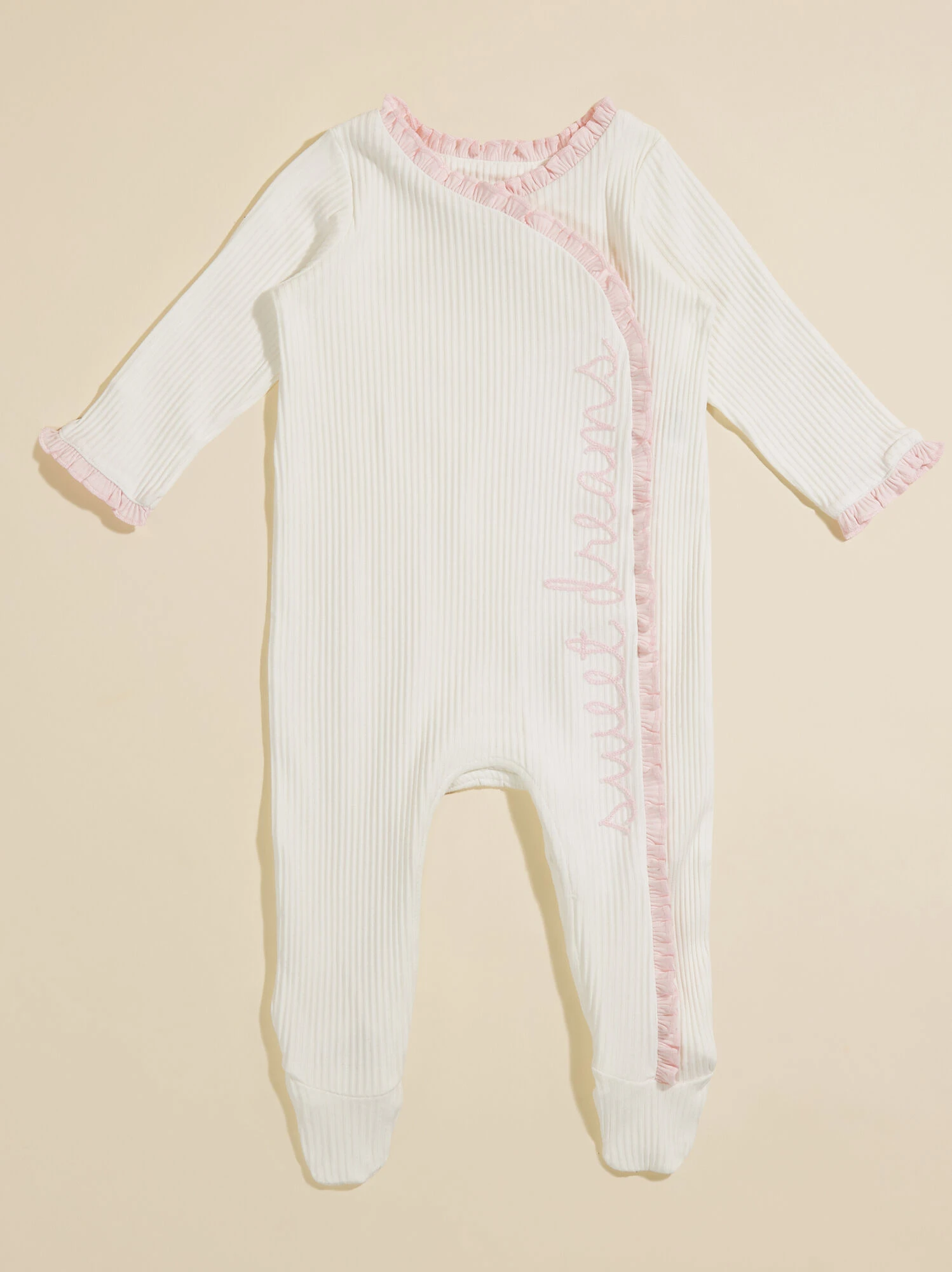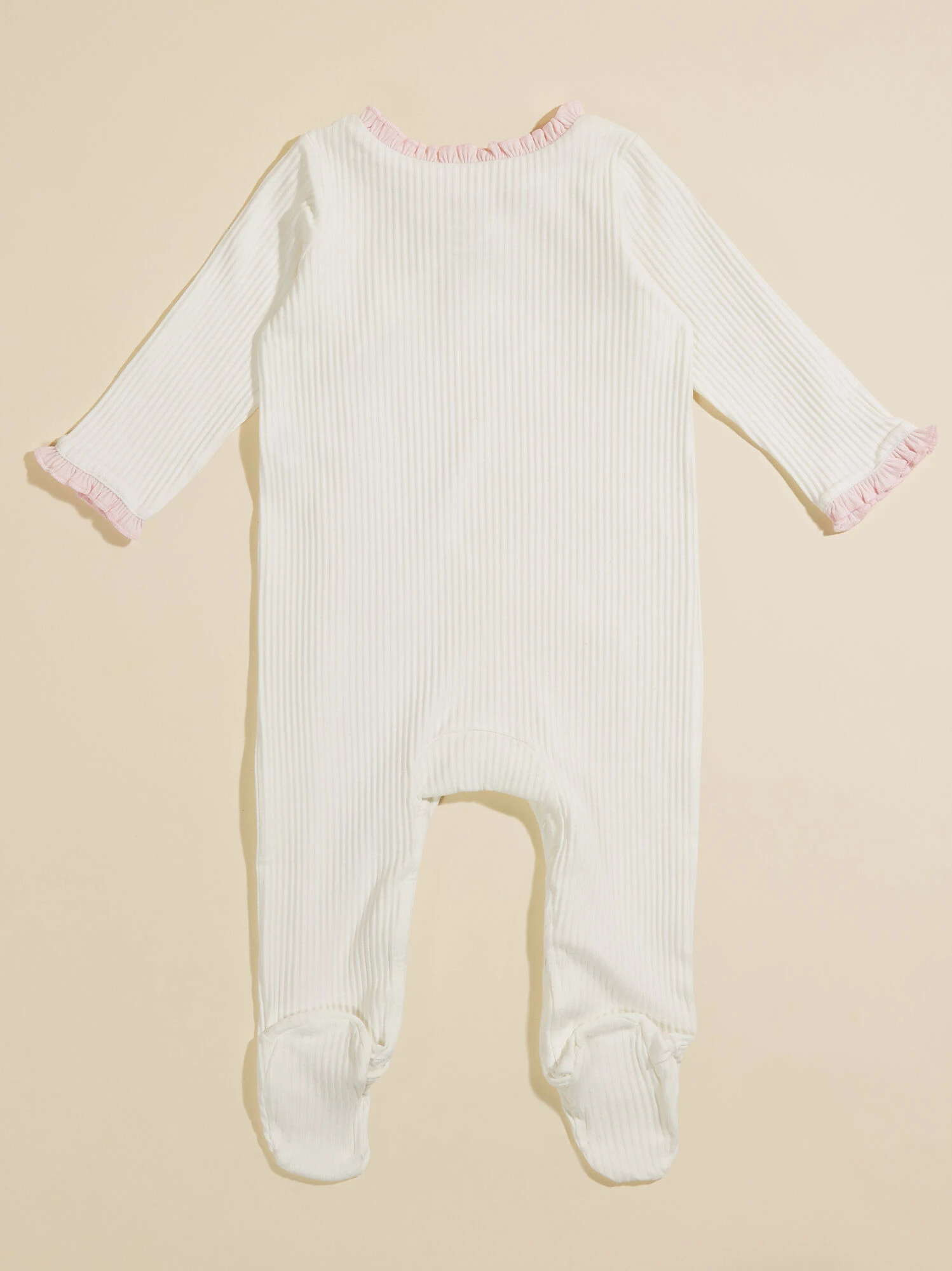 Let your babe experience ultimate comfort in this ribbed sleeper providing a soft stretch for easy movement and snug support during bedtime. This footie showcases a delightful chain-stitched embroidery and a full body ruffle detailing for a touch of sweet elegance.