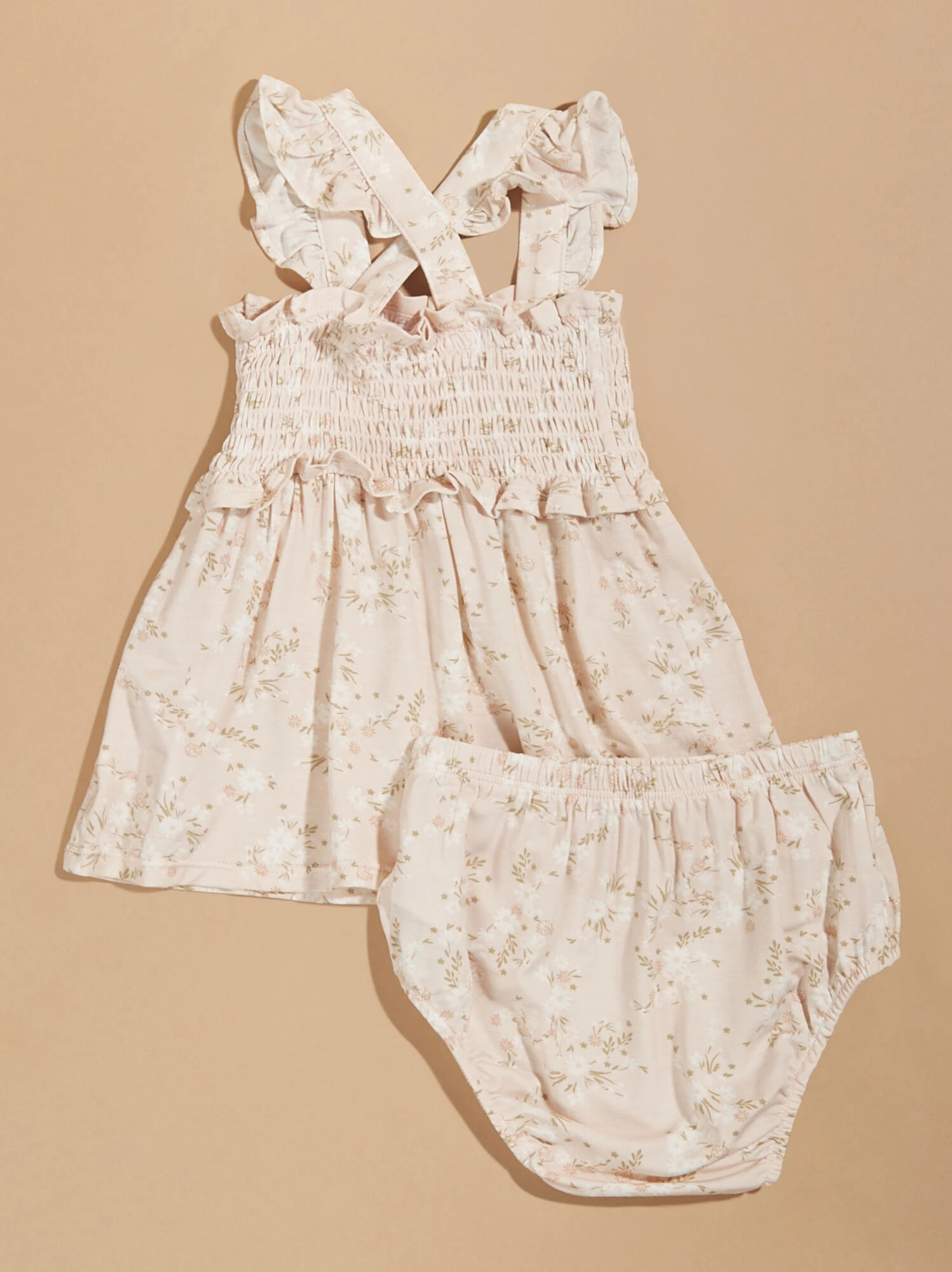 Effortlessly elegant for any outing, this floral outfit is the perfect staple set for your girl all season long. The smocked top is seamlessly complimented by the ruffle waistline and straps with a cute, flowy fit. Crafted from eco-friendly bamboo material, the buttery smooth fabric offers a soft stretch for maximum comfort.