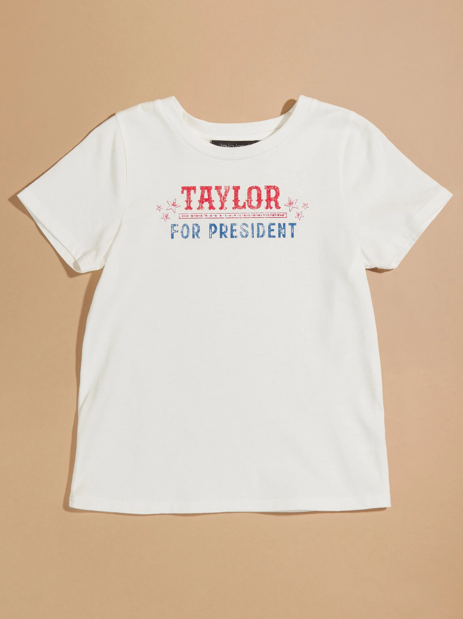 Let your little one show some love for their favorite pop star in this Taylor for president graphic tee, showcasing bold style and a playful spirit. Perfect for your little fan, this tee adds a touch of fun to any outfit while the crew neckline and lightweight feel ensure maximum comfort.