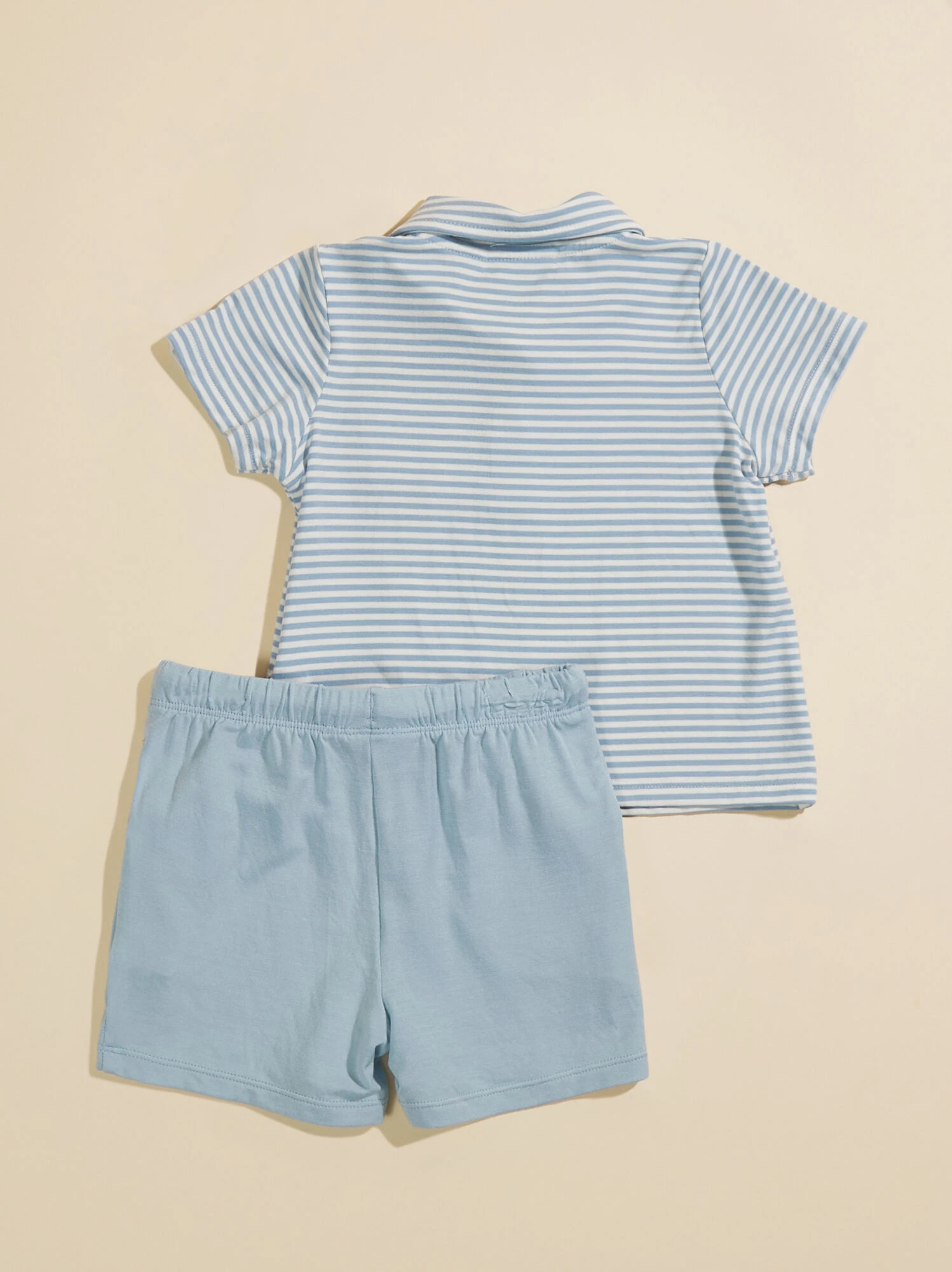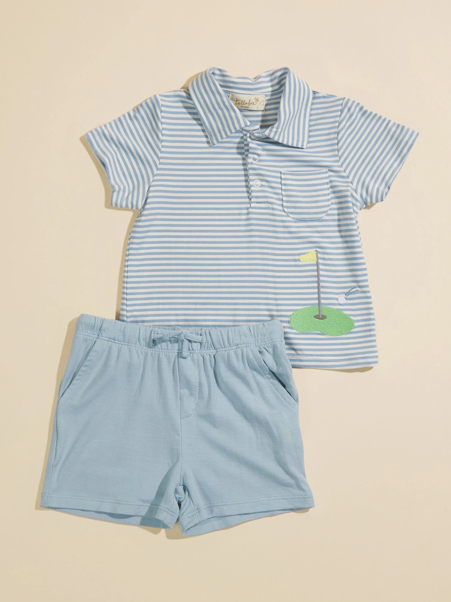 This preppy look is sure to look oh-so cute on your boy with the striped polo style shirt and matching shorts, easy for a day on-the-go. The golf inspired applique and small pocket detail will make this a new sporty favorite for your little. Crafted from an ultra soft eco-friendly fabric from bamboo, this set is sure to stay lightweight for a full day of activities.