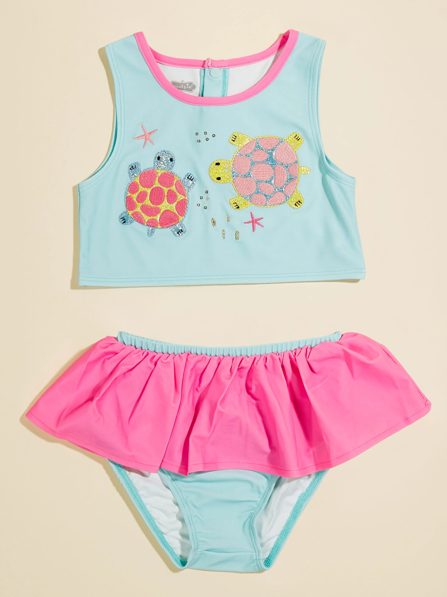 Get your girl ready for a day of summer fun with this vibrant swim set featuring a sea turtle design top with sparkle accents and playful ruffle bottoms. The buttery smooth material offers a light stretch, while providing protection for your girl in the sun with a UPF 50+ rating.