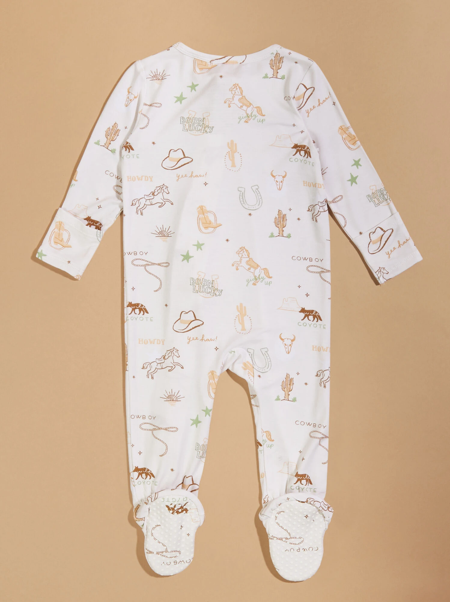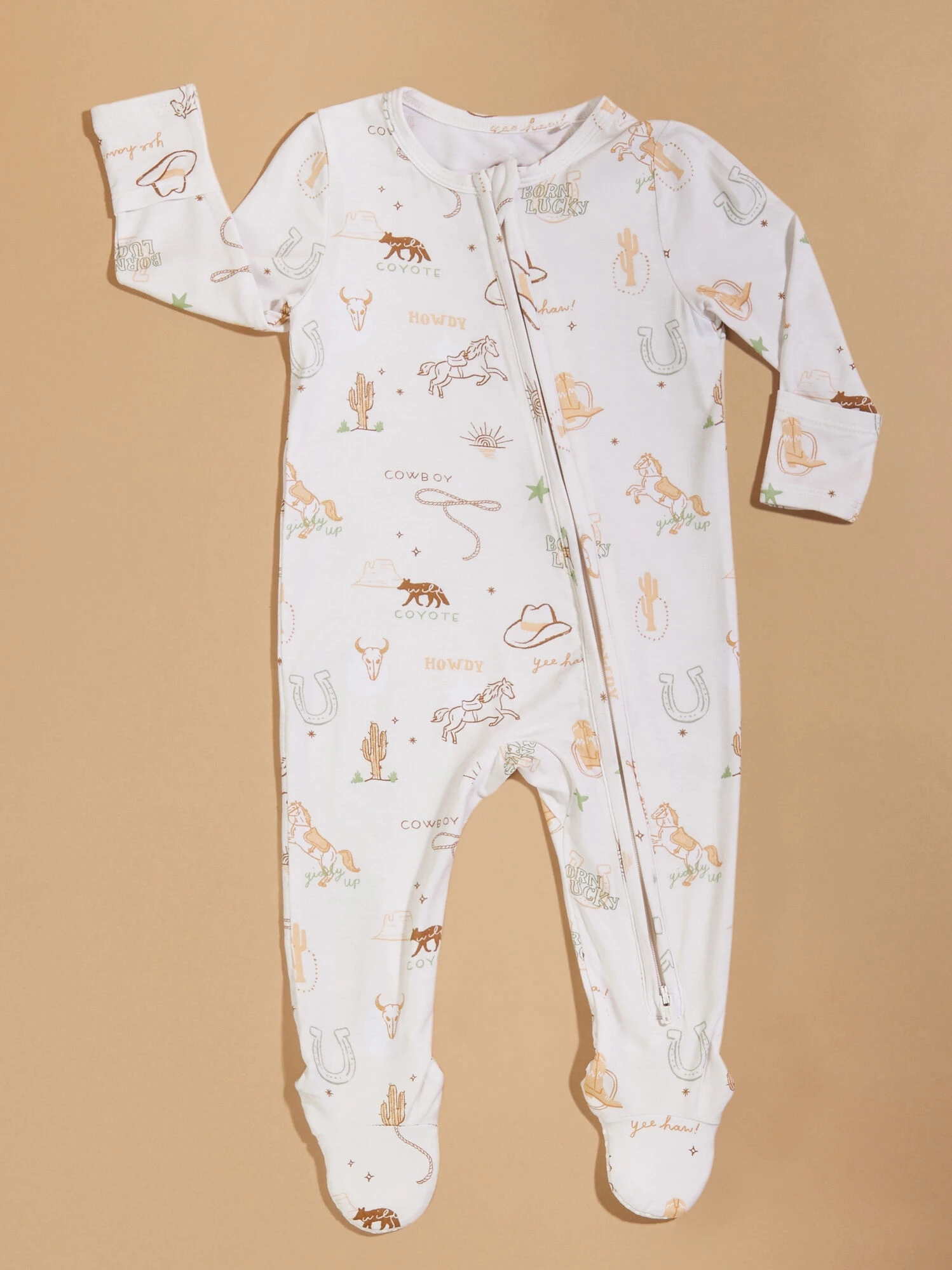 Saddle up your little wrangler for bedtime adventures with this wild west footie. This adorable one-piece features a playful print with cowboys, horses, or coyotes, bringing the spirit of the Wild West to your little one’s dreams. Made from soft bamboo fabric, it’s perfect for keeping them warm and comfy.